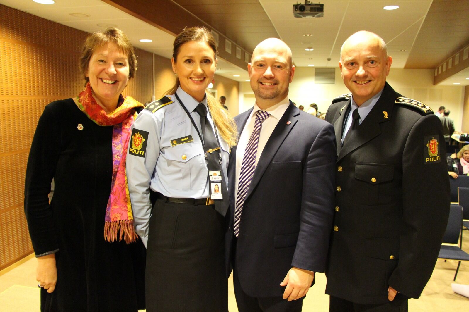 FIRKLØVER: Ordfører Marianne Borgen (SV), prosjektleder Hanne Finanger, justisminister Anders Anundsen og stasjonssjef på Stovner, John Roger Lund, var med på åpningen av Prosjekt November. Foto:Bilde 1 av 1