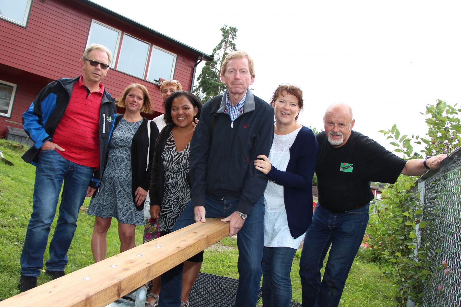 HØYT OG LAVT: Bydelsutvalgsleder Knut Røli (Ap) får en dytt av Terje Olafsen i Omsorgsbygg, Monique Nyberget (Ap), barnehagelederen Unni Fossbakken, fagleder Mai-Jill Hedemark i Alna sør barnehageenhet, resultatsenhetsleder Elisabet Eggan i Alna Sør barnehageenhet og lekeplassinspektør Geir Solberg utenfor Lindebergskogen barnehage. Foto:Bilde 1 av 1