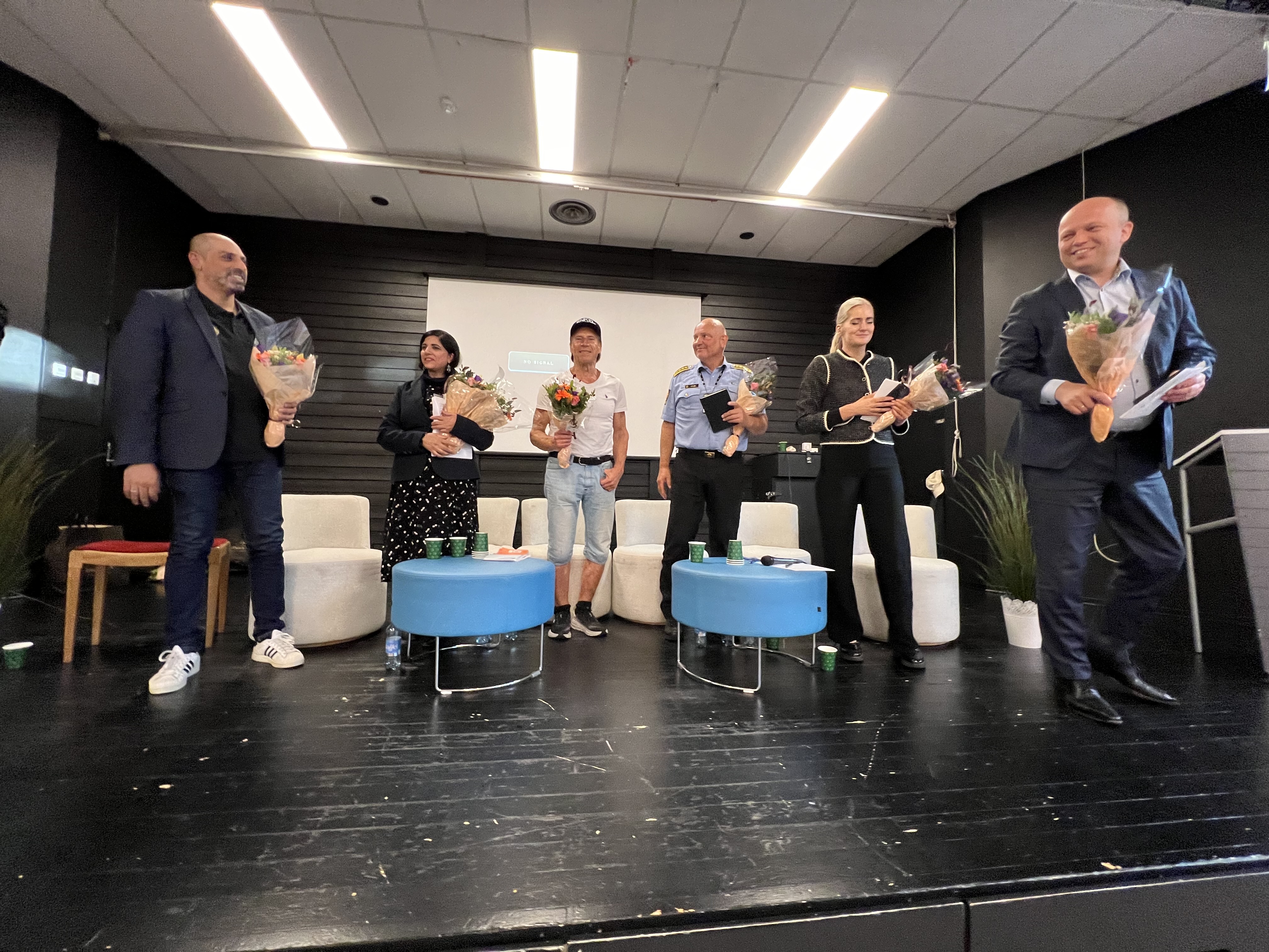 SAMLER TANKER: Groruddalen Senterparti tok initiativ til folkemøtet tirsdag kveld. Her har Adnan Naeem (f.v.) Nasreen Begum, Jan Bøhler, John Roger Lund, justisminister Emilie Enger Mehl (Sp) og finansminister Trygve Slagsvold Vedum (Sp) fått blomster av Groruddalen Senterpartis leder Rune Svendsen. FOTO: Tom EvensenBilde 1 av 11