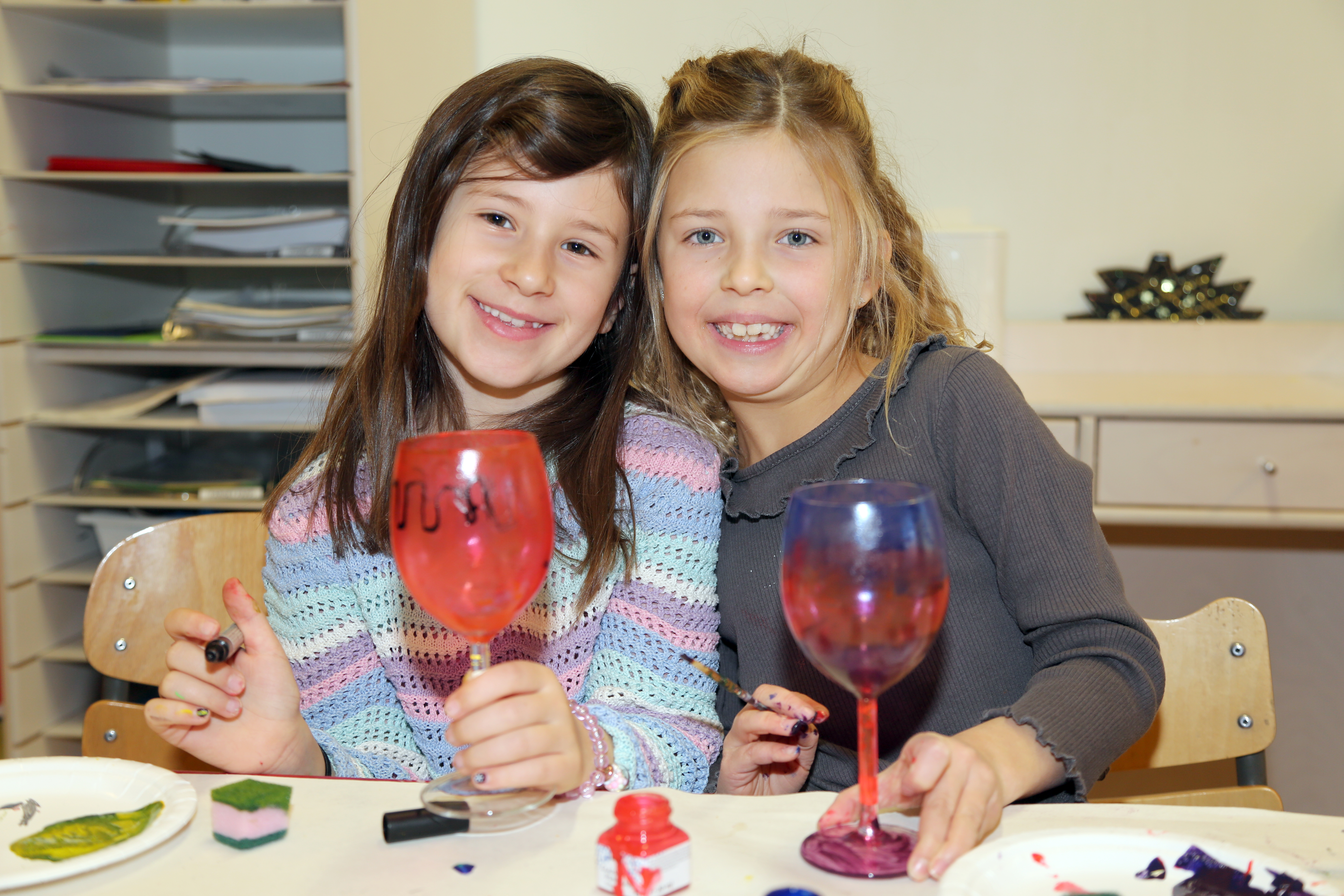 UNGE GLASSMALERE: Emma (8 t. v.) og Ellie (7) frydet seg på barnas juleverksted da de malte glass. De var blant de mange som møtte opp og som til sammen satte ny deltakerrekord på verkstedet. FOTO: Rolf E. WulffBilde 1 av 7