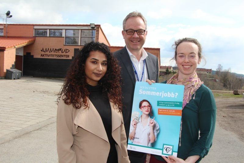 UNGT ENGASJEMENT: Leder av Grorud ungdomsråd, Jamila Dausch (17), bydelsdirektør Øystein Eriksen Søreide og Ida Johannesen i Bydel Grorud oppfordrer ungdom mellom 14-19 år å søke på sommerjobb. Foto:Bilde 1 av 1