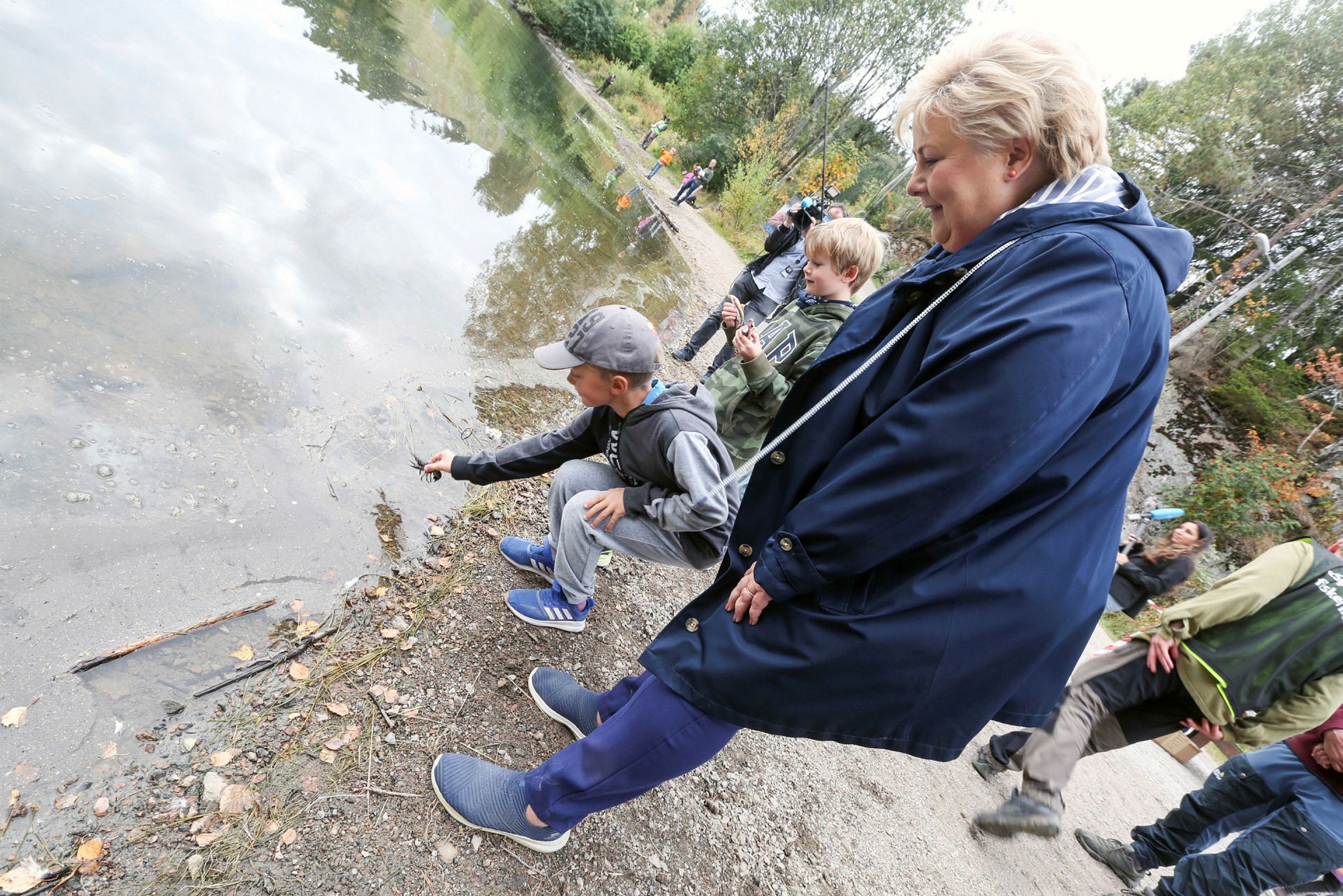 FULGTE REGLENE: Eirik (8) fulgte krepse-reglene og fikk hjelp av Erna Solberg til å slippe krepsen ut i Trollvann igjen. Foto: Rolf E. WulffBilde 1 av 1