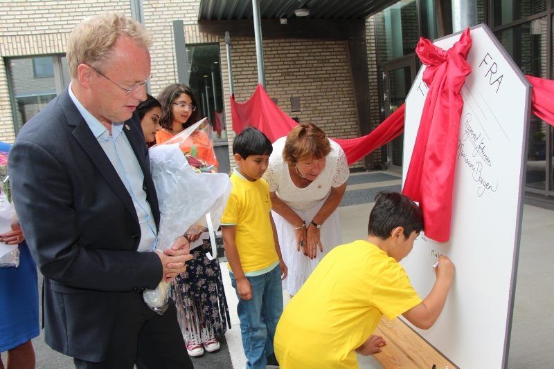 AUTOGRAF: Byrådsleder Raymond Johansen og ordfører Marianne Borgen signerte en «til og fra»-lapp utenfor nye Haugenstua skole sammen med Aiza Parveen, Jabir Shams, Mahdi Mohamadi og Nurinnisa Ece Erik. Foto:Bilde 1 av 2For å se disse bildene må du ha et abonnement Åpningsfest for nye Haugenstua skole: Signerte for en ny tid Caroline Bremer Publisert 24. aug 16 kl. 07:56 Del på sosiale medier Del Facebook Twitter E-post Abonnement