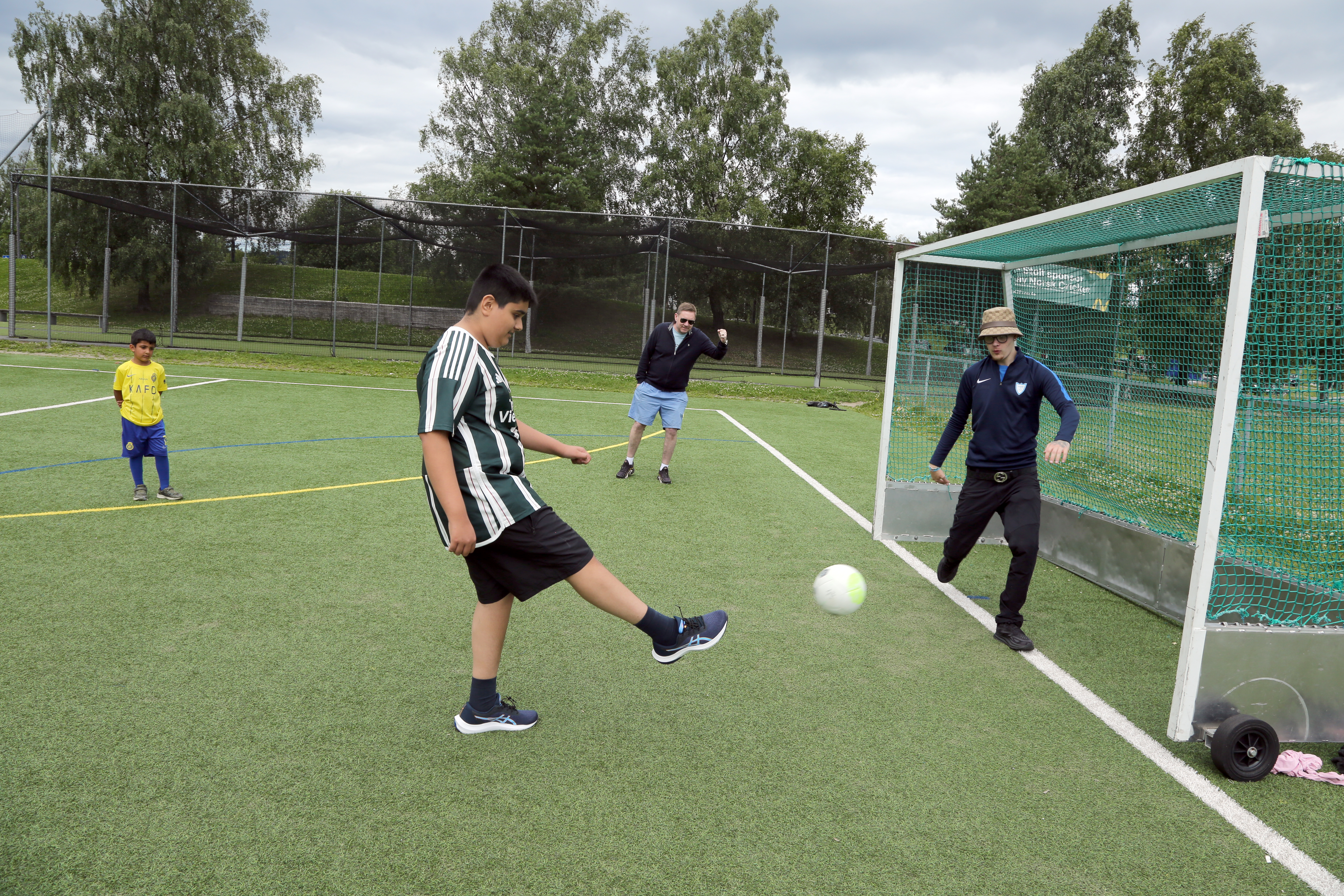 ELEGANT STIL: Sikandar (12) storkoste seg da han kunne sende fotballen i mål bak keeper Kevin Aleksander Pettersson. Prosjektleder i Furuset Forum, Rune Gjelberg, står bak og heier for fullt. FOTO: Rolf E. WulffBilde 1 av 6