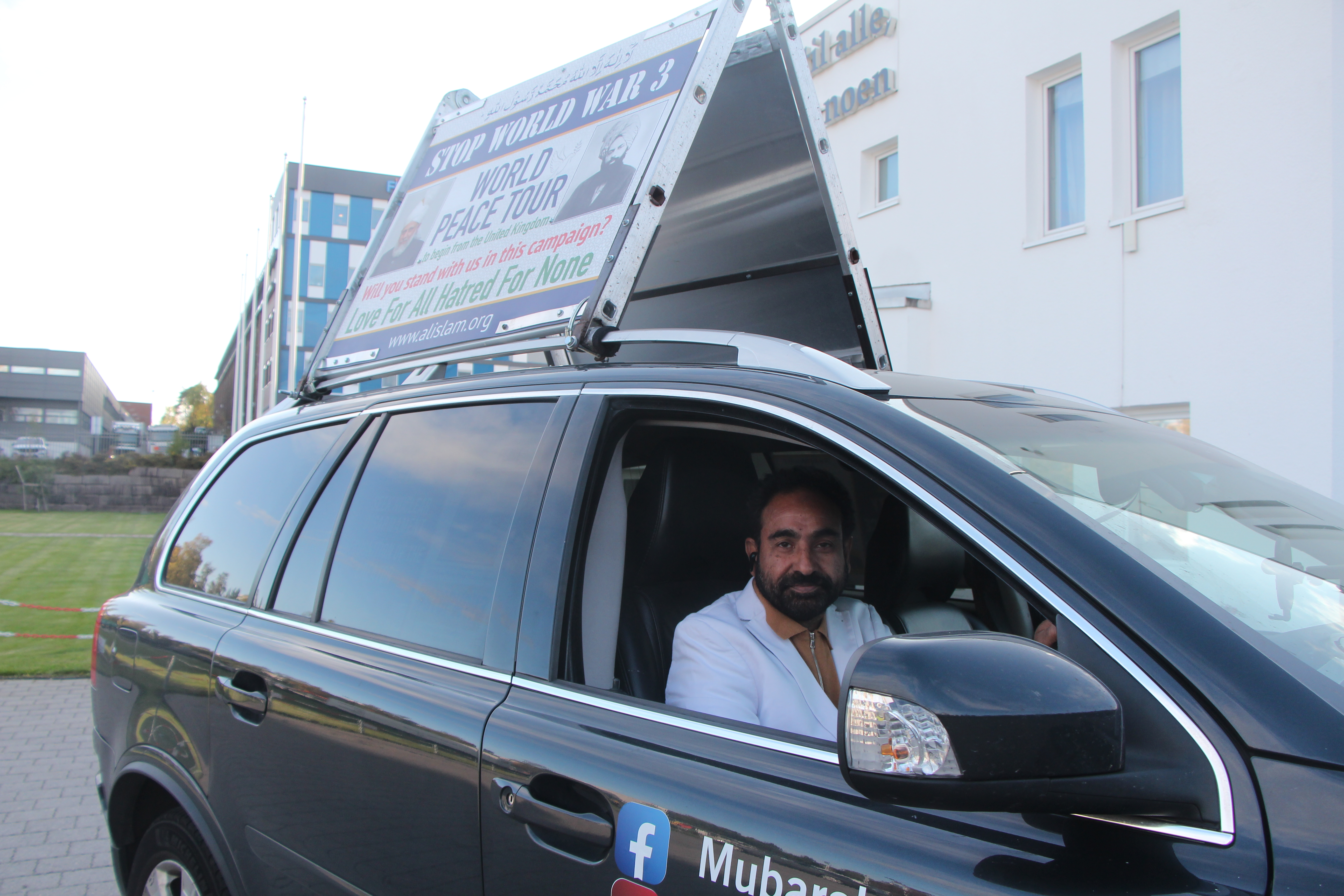 Mubarak Ahmed fra Gilford i England skal bruke det neste året i bilen sin og kjøre fra land til land og spre budskapet om fred og kjærlighet. – Vi oppnår fred med diskusjoner, ikke våpen.