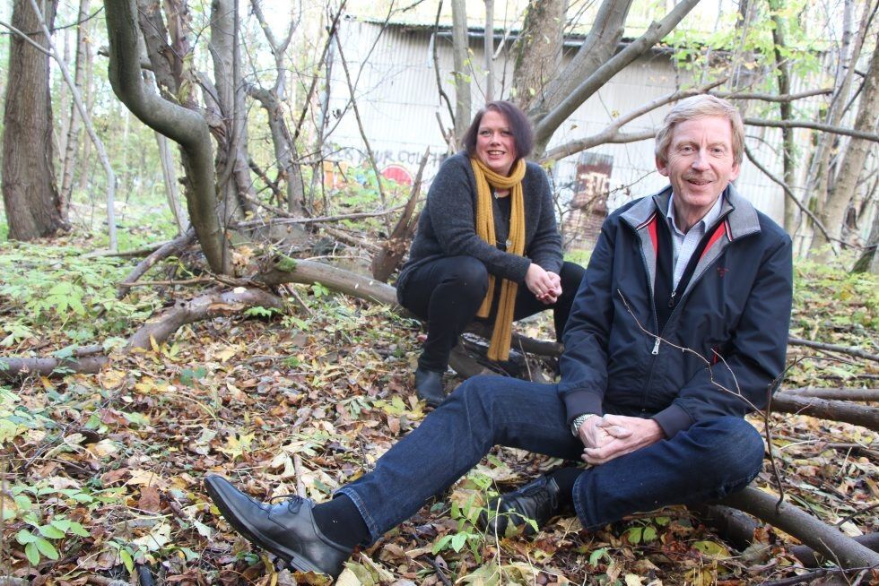 KAN ENDELIG SLAPPE AV: Kommunen har tatt over Haugerudparken og skal bevare skogsfølelsen. Lagerbygget bak skal rives, noe Knut Røli og Monique Nyberget-Hiller er fornøyd med. Foto:Bilde 1 av 2
