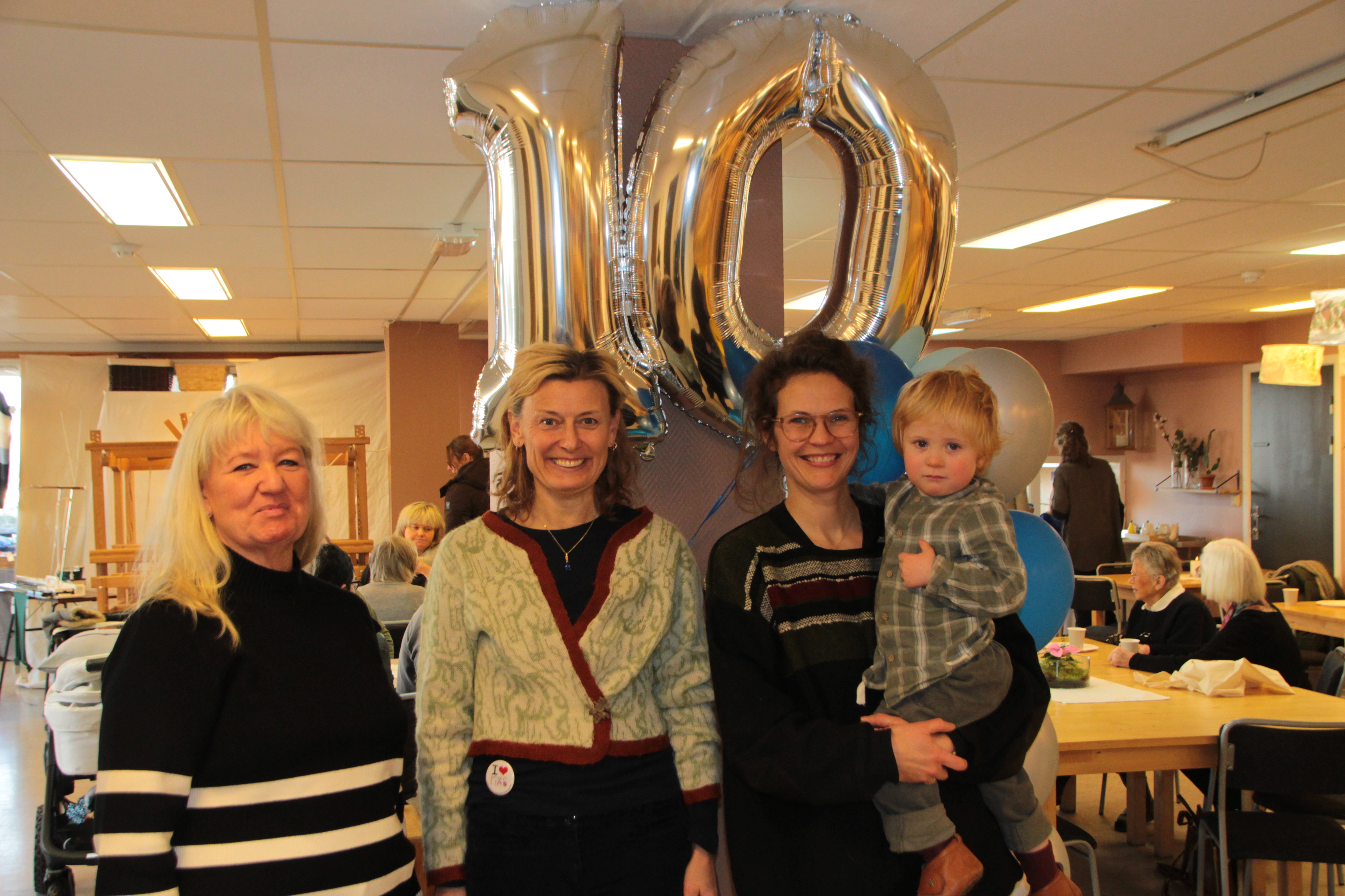 10 ÅR: Årets åpent hus brukes til å feire 10 år på Veitvet. Lærerene hos MAS Rigmor Grue , Merethe Finsnes, Kirsti Willemse og sønnen Eldar (2) gleder seg til ti nye år. Bilde 1 av 2