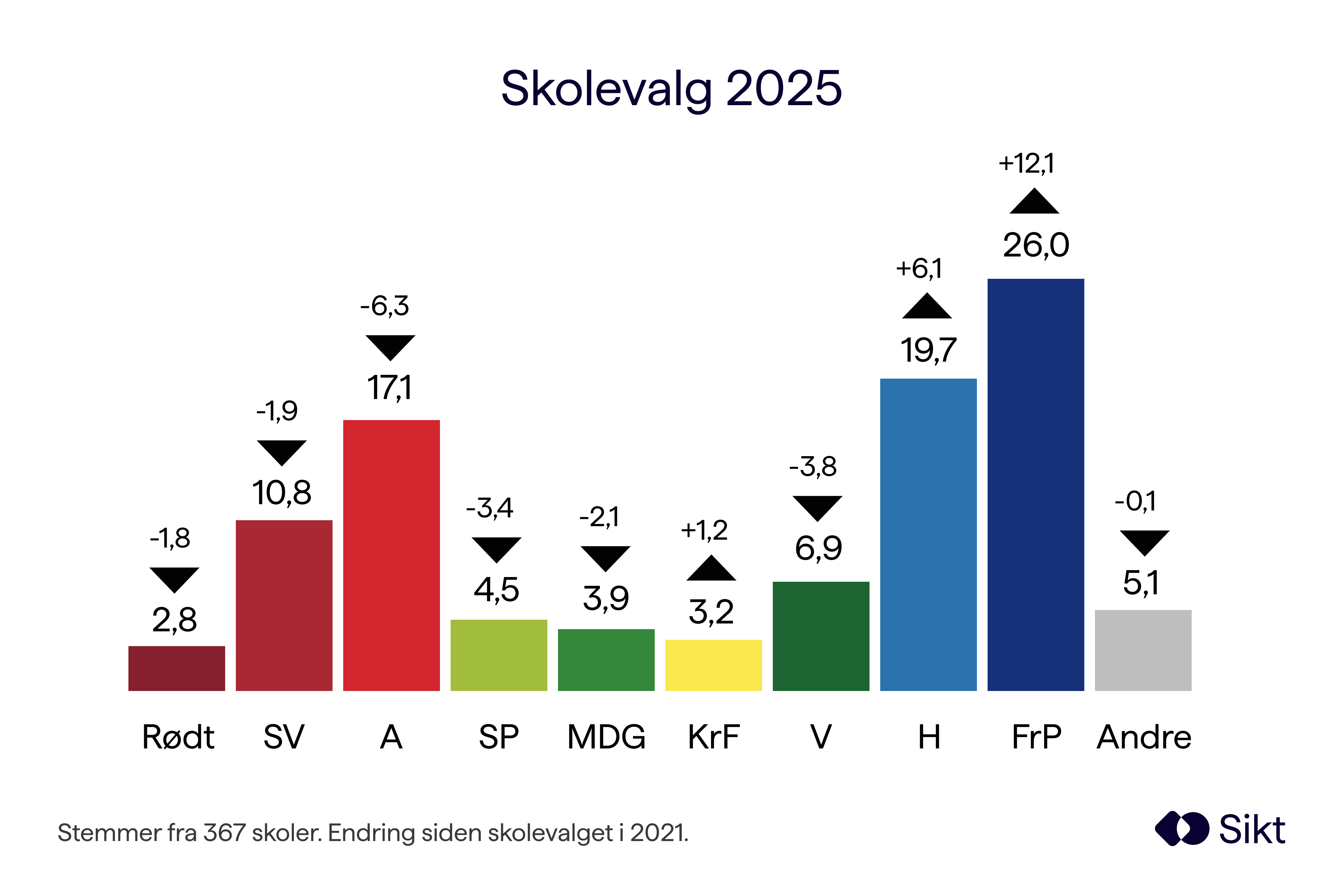 Høyre går også fram fra 2021, men litt tilbake fra 2023, og lander på 19,7 prosent. Arbeiderpartiet får 17,1 prosent, og er med det mindre enn Høyre. Både Rødt, MDG og KrF faller under sperregrensen i skolevalget for 2025.