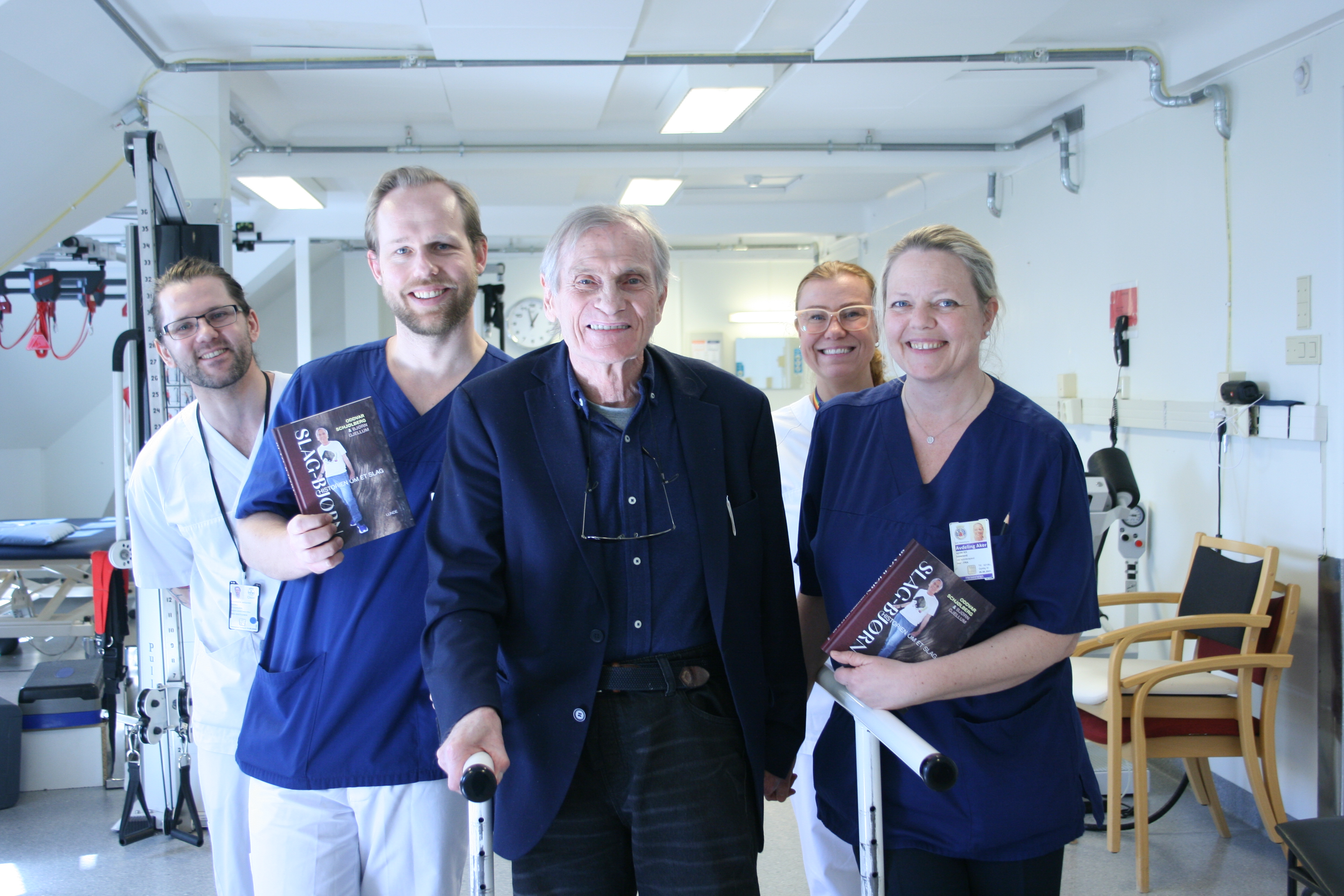 EN GAVE TILBAKE: Bjørn Gjellum fikk slag for fem år siden og takker Forsterket Rehabilitering på Aker for at han i dag kan gå ved hjelp av en krykke. Mandag var han tilbake på avdelingen for å dele ut boka om veien tilbake. Her er sykepleier Markus Berg (f.v.), fysioterapeut Magnus Hågå, Bjørn Gjellum, avdelingssykepleier Therese Skogsberg og avdelingsleder for fysio og ergo, Ingvild Rosseland.Bilde 1 av 3