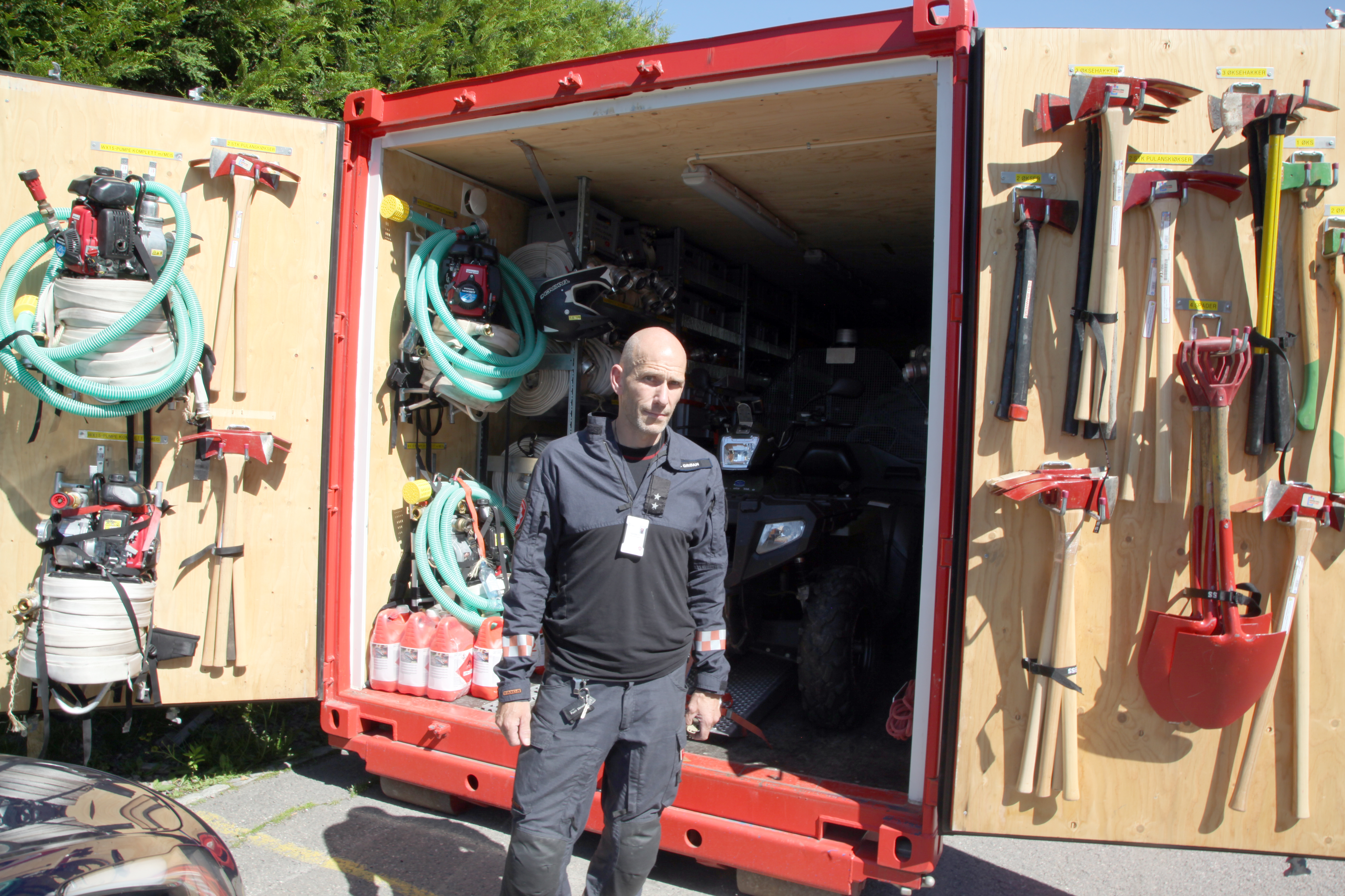 GODT BEREDT: Underbrannmester Morten Grøan viser frem utstyret som brukes ved skogbrannberedskap på stasjonen i Grorud. Foto: Rolf E. Wulff.Bilde 1 av 2