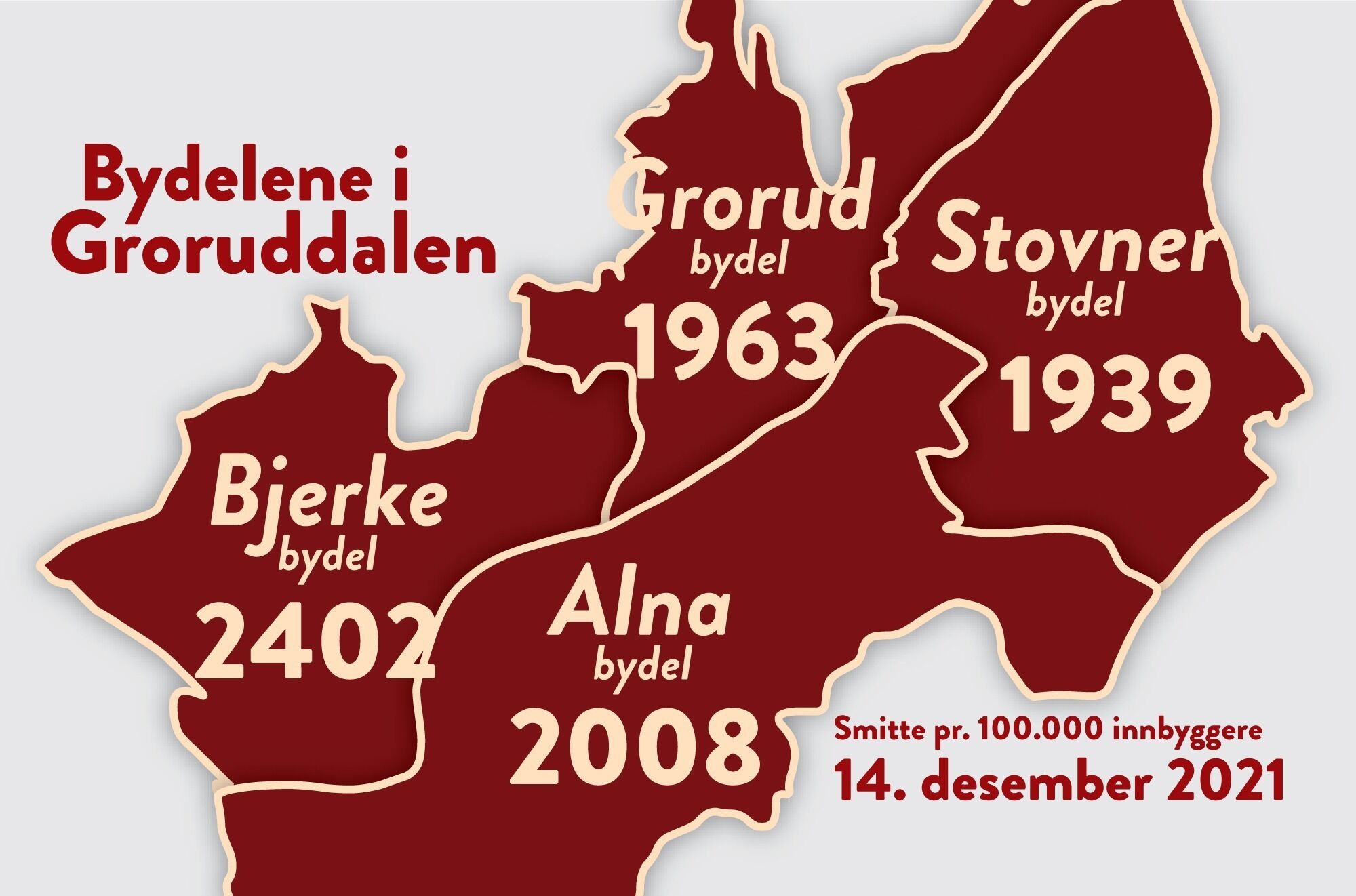 Det er delta-varianten som fortsetter å drive fram smittetallene, og det er blodrødt i hele Groruddalen. Alle fire bydeler har fortsatt stigende smitte, og Bydel Alna har for første gang over 2.000 smittede pr. 100.000. I bydelene Grorud og Stovner er smittetallene også høye.
