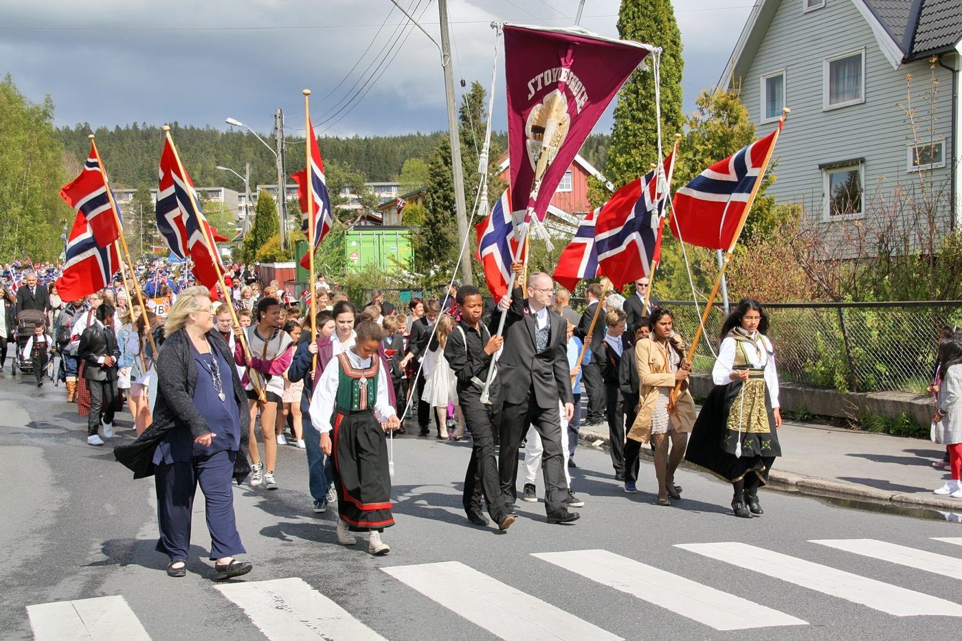 Stovner skolekor sang av full hals til tross for øsende regnvær under flaggheisingen pa Stovner barneskole. Men da det var tid for borgertog tittet sola fram.