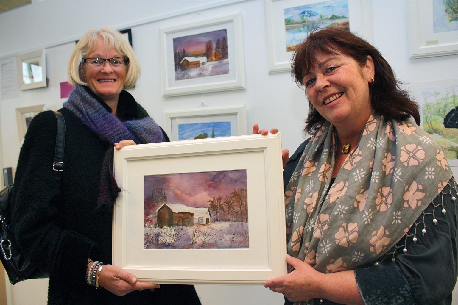 Kreativt verksted og malegruppa fra aktivitetshuset på Lindeberg preger biblioteksveggene med sin kreativitet. Tove Sveen synes det er gøy å endelig kunne stille ut.