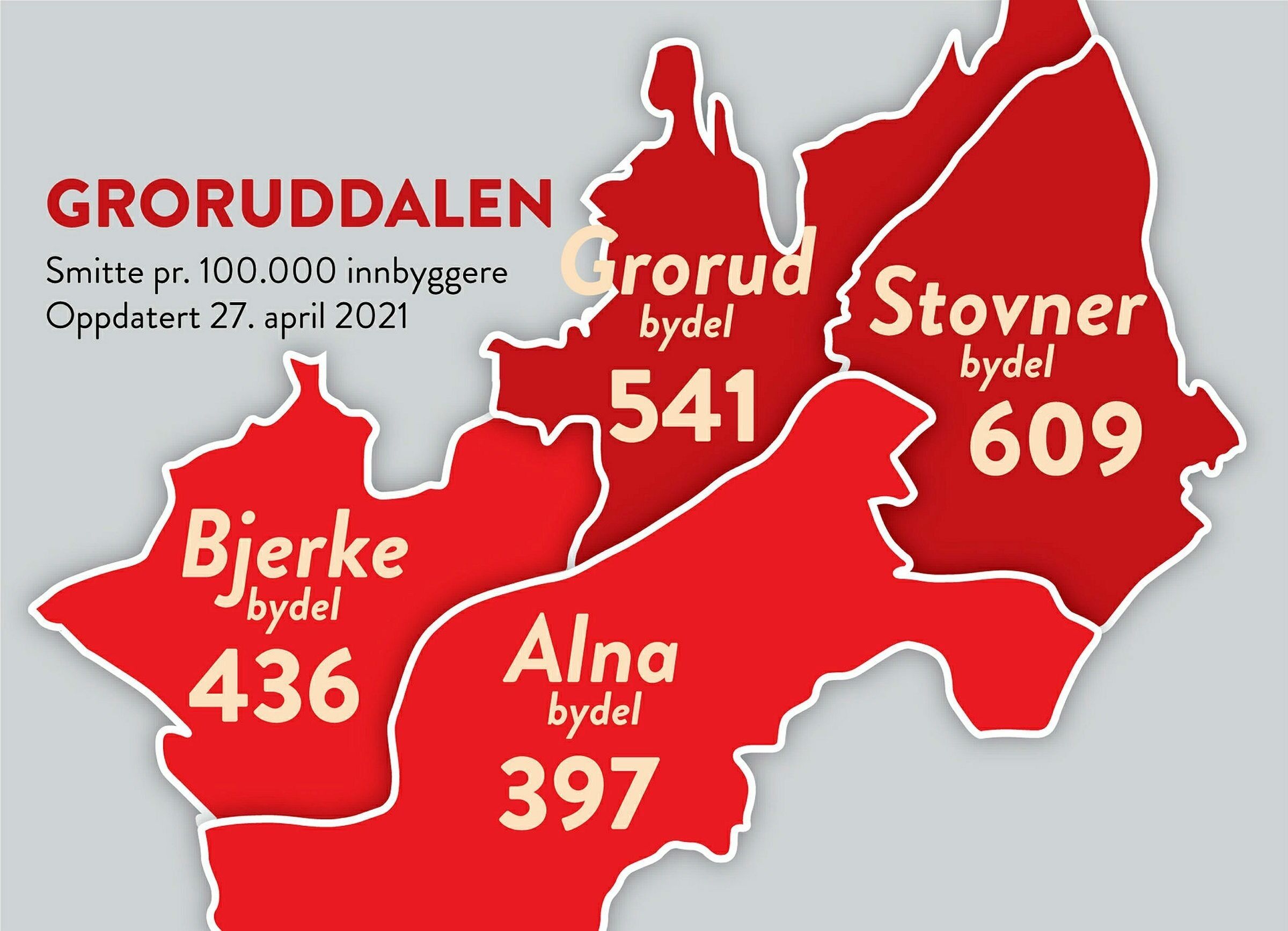 I Bydel Grorud har smitten de siste dagene flatet ut etter lenge å ha sunket. Nå har bydelen det nest høyeste smittetrykket i Groruddalen, på 541,4 tilfeller pr. 100.000. De siste to ukene har det vært relativt stabile smittetall i bydelen, og med unntak av to dager har det vært mellom 10 og 18 nye tilfeller hver dag. Tirsdag 27. april ble det registrert 13 nye smittetilfeller i bydelen. Smitten fordeler seg jevnt mellom alle under 60 år, og det er lite smitte blant den eldre befolkningen som i stor grad er vaksinert.