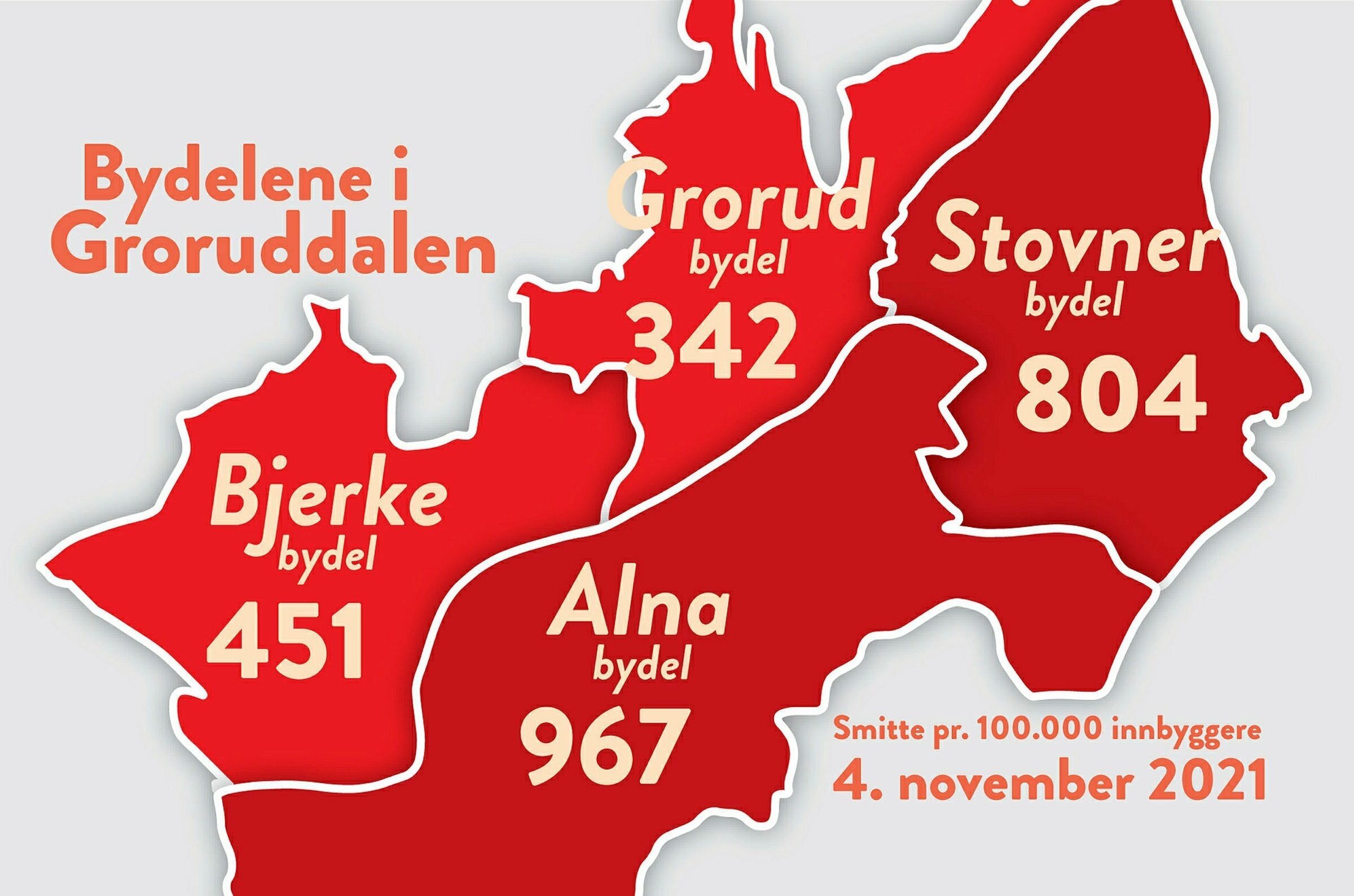 Slik var koronasituasjonen torsdag 4. november. Foto:Bilde 1 av 2For å se disse bildene må du ha et abonnement Stovner og Alna på smittetoppen Caroline Hammer Publisert 4. nov 21 kl. 16:35 Del på sosiale medier Del Facebook Twitter E-post Abonnement