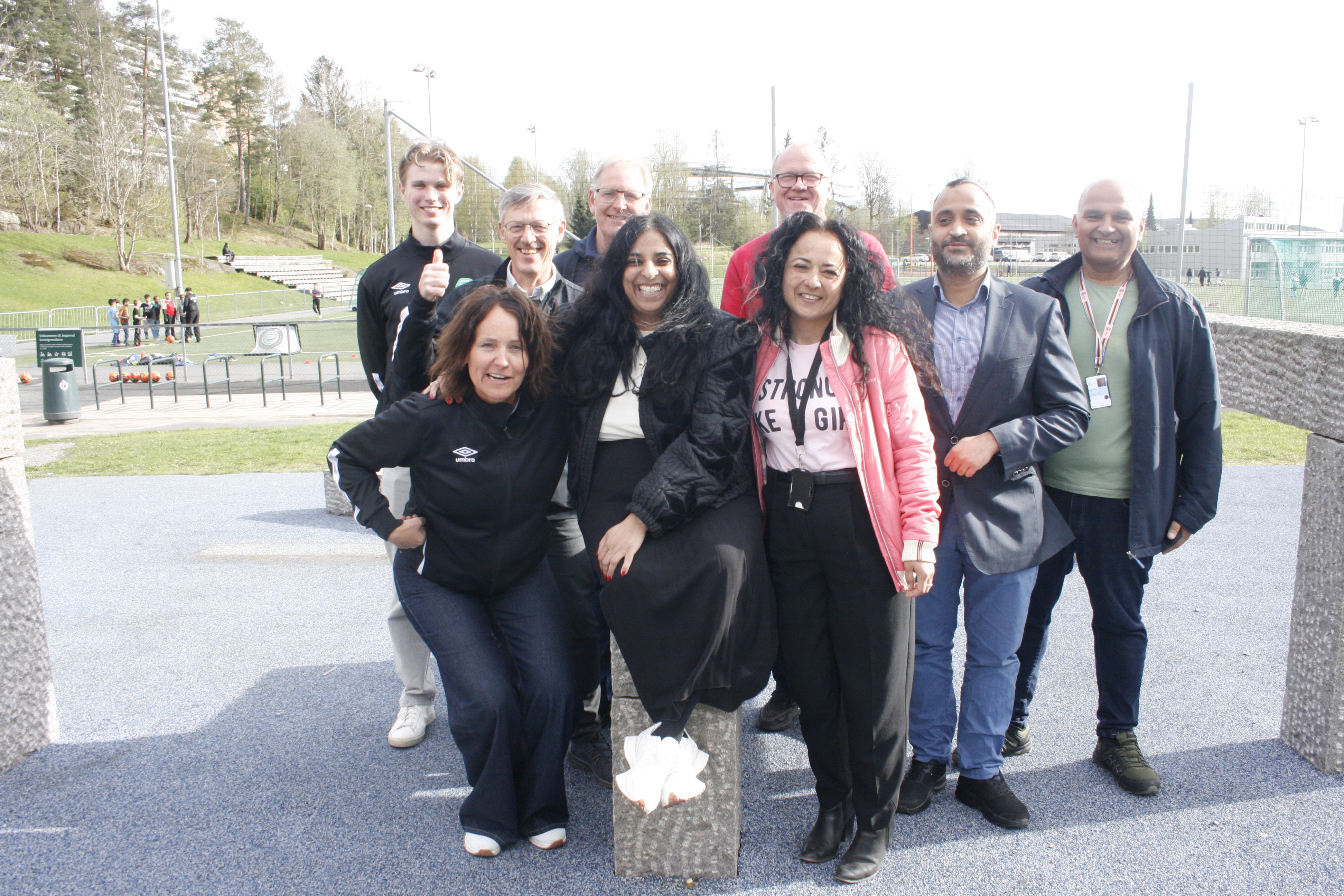 FLERE SKAL MED: Under ti prosent av førsteklassingene i nærområdet rundt Stovner SK er med i klubben. Nå får klubben en gavepakke fra regjeringen og Oslo idrettskrets. Det feirer denne gjengen. Bak fra venstre Gaute, styreleder Sven Sikle, generalsekretær Magne Brekke i Oslo Idrettskrets, leder Frode Jacobsen i Oslo Arbeiderparti , BU-leder Rashid Nawaz i Bydel Stovner (Ap), daglig leder Mariann Staxrud Utstumo (foran) i Stovner SK, kultur- og likestillingsminister Lubna Jaffery (Ap), leder av kretsstyret, Marcela Montserrat Fonseca Bustos, og bystyrerepresentant Abdullah Alsabeehg (Ap).Bilde 1 av 2