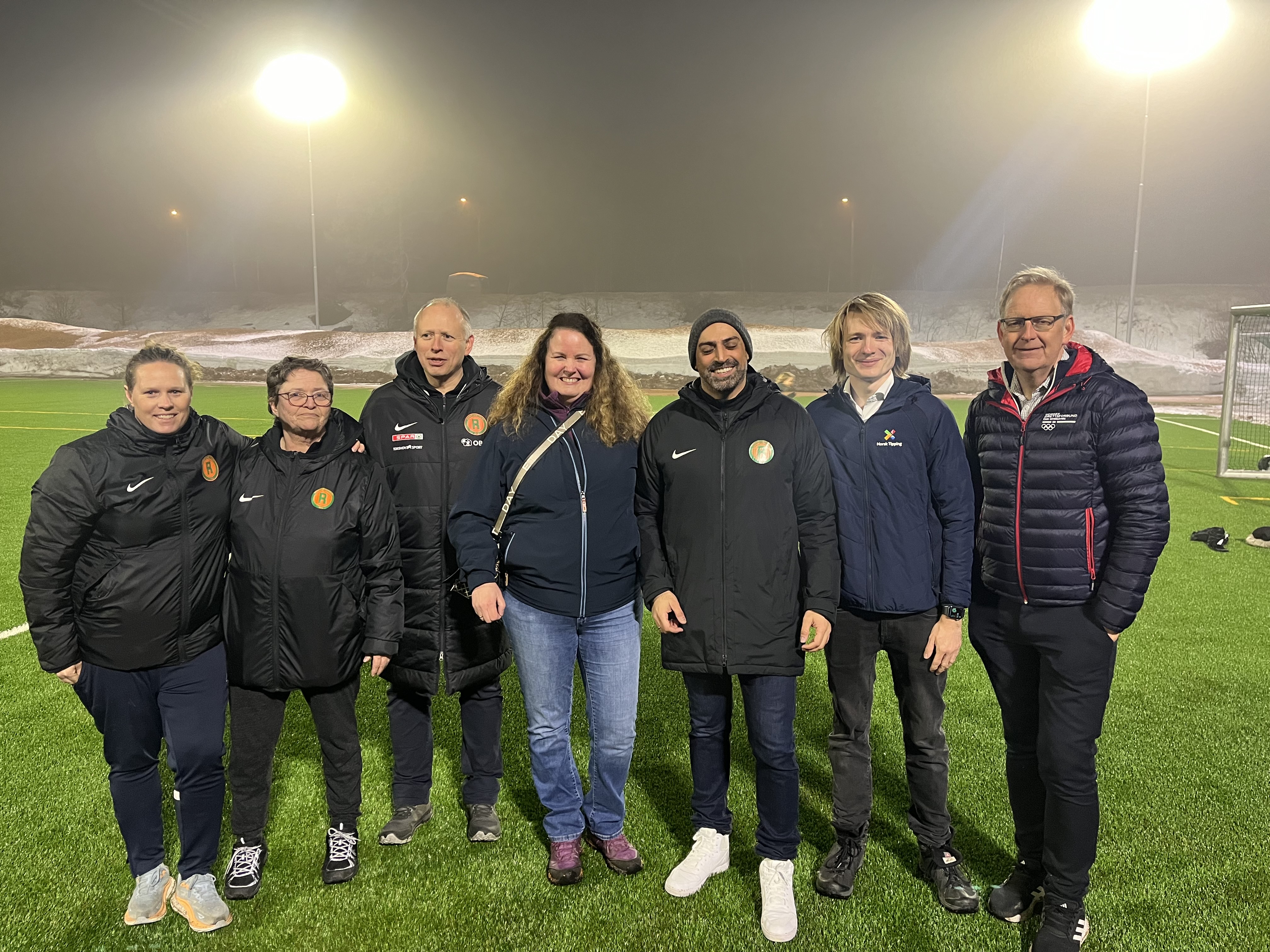 SAMLET PÅ ROMSÅS: Marte Vik Edvardsen, daglig leder Romsås IL, (f.v), Sissel Smeby, styreleder Romsås IL, Øystein Røssel Andersen, leder Fotballgruppa i Romsås IL, Sylvia Brustad, styreleder Norsk Tipping, Adnan Naeem, Romsås IL, Stian Seland, Fagsjef samfunnskontakt Norsk Tipping, Magne Brekke, Generalsekretær Oslo Idrettskrets.