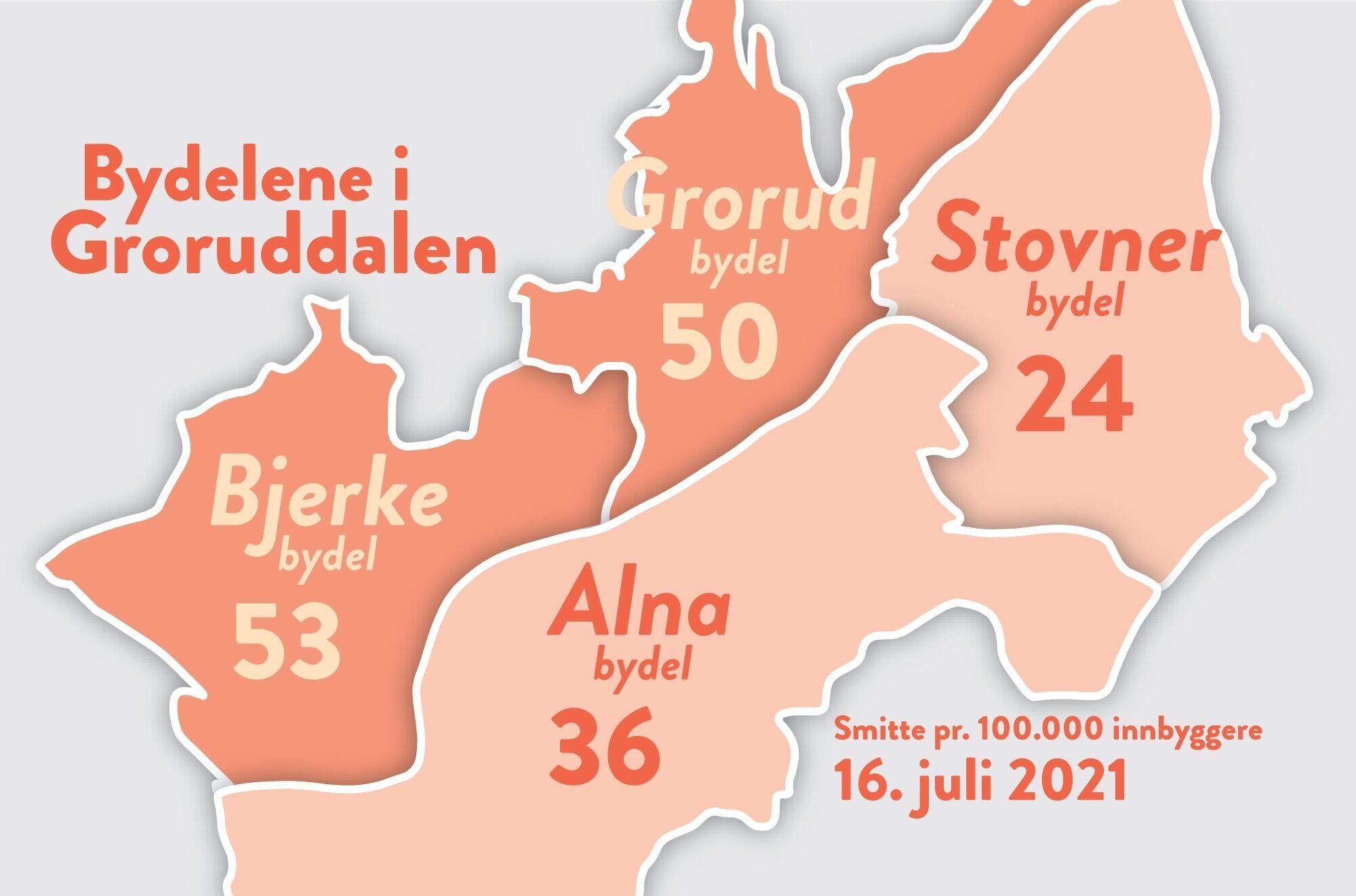 Smitten i Groruddalen er størst blant befolkningen i Bydel Grorud og Bjerke, men ser man på hele Oslo er trenden den samme som de siste ukene – med størst smittetrykk vest i byen. Bydel Frogner 44 nye tilfeller de to siste ukene mot Stovner 8 tilfeller de to siste ukene.