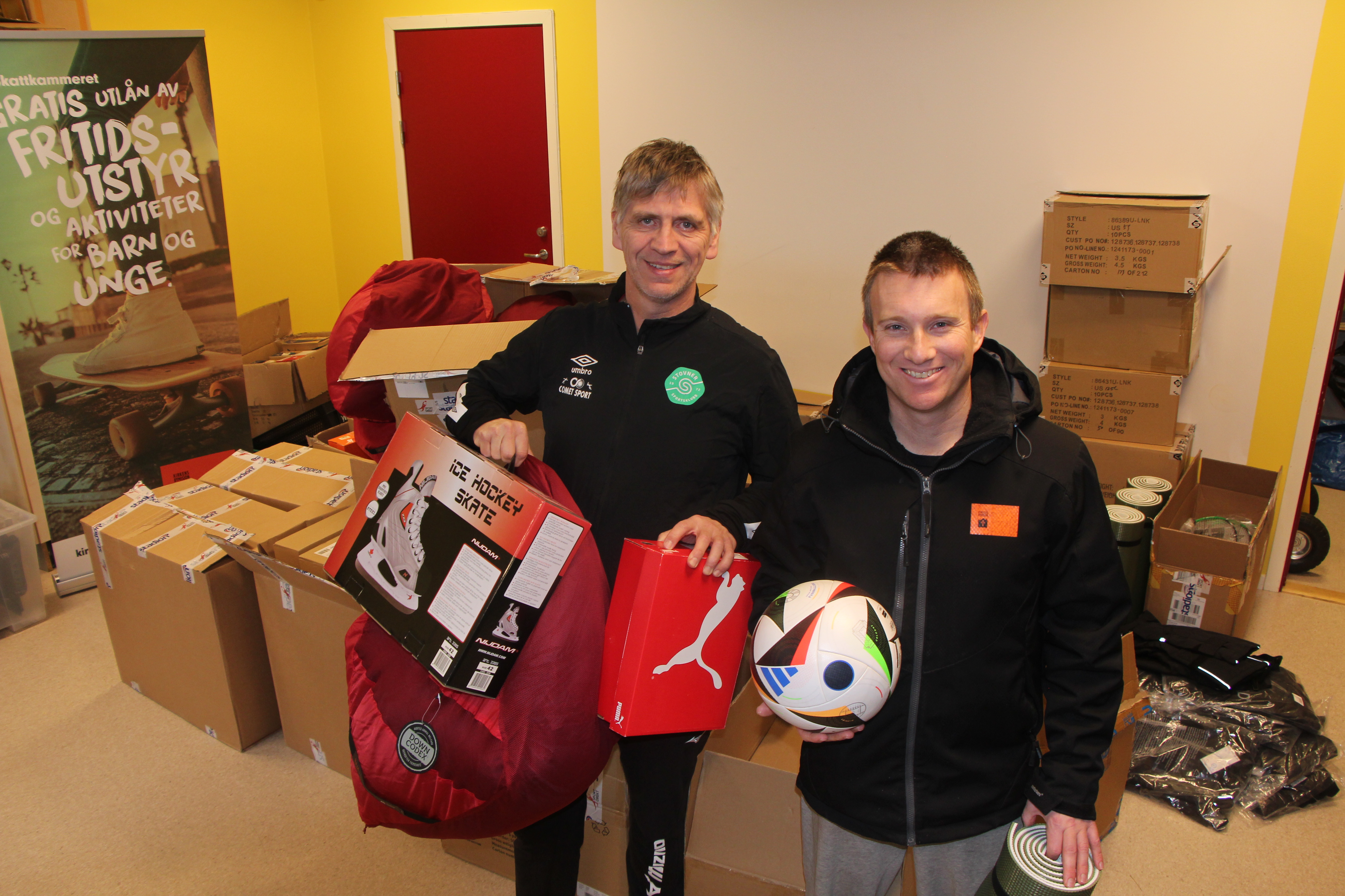 GULL I SKATTKAMMERET: John Walstad (t.v) og Stovner SK var på besøk hos Kirkens Bymisjons skattkammer med en veldig fin julegave: utstyr til idrett og aktivitet verdt opp til 500.000 kroner. Her med Kristian Randen i Skattkammeret.Bilde 1 av 2