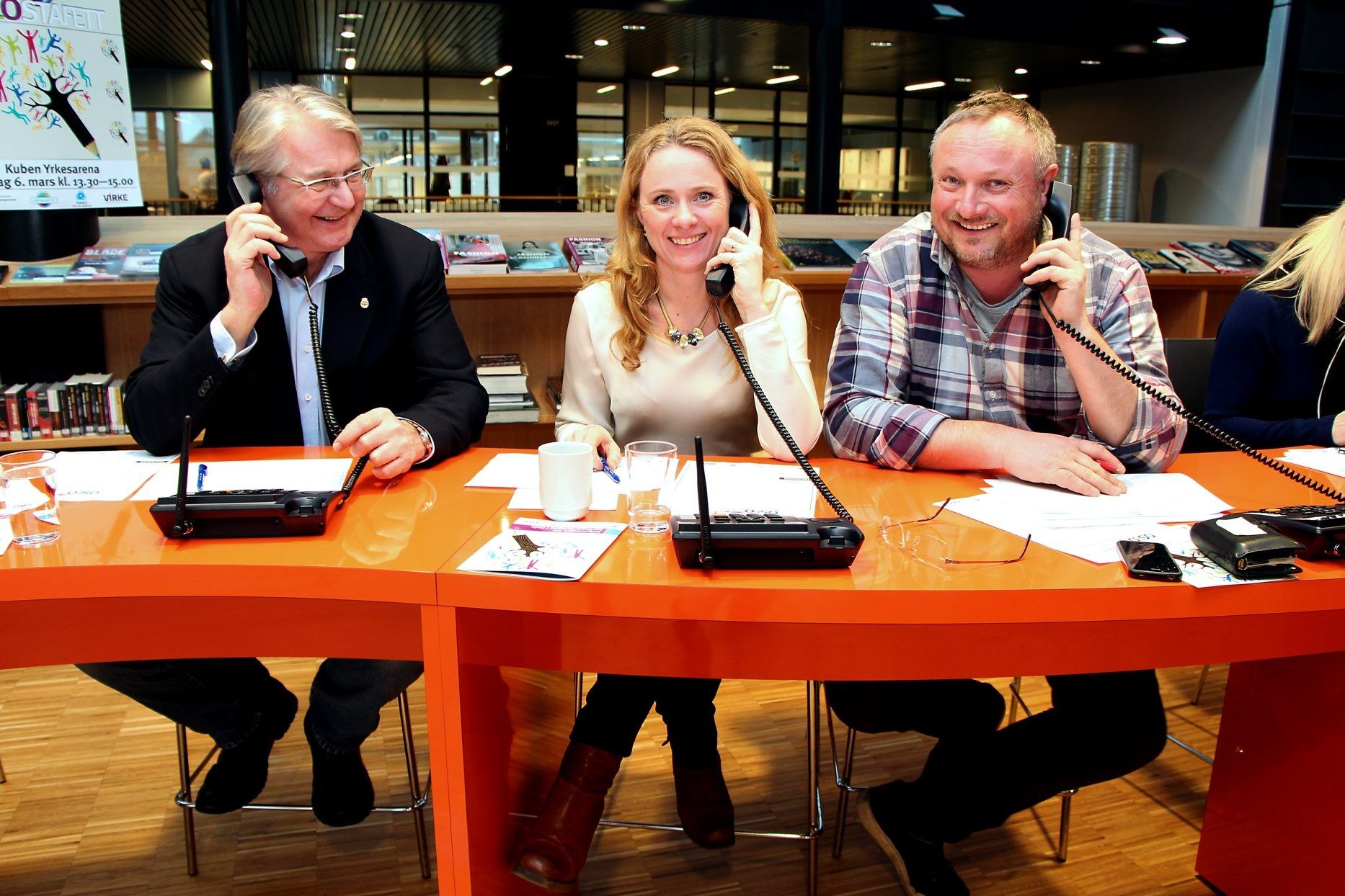 Ordfører Fabian Stang (H), skolebyråd Anniken Hauglie (H) og mesterkokk Bent Stiansen tok opp røret på Kuben yrkesarena og ringte til lærebedrifter for å promotere lærlinger.