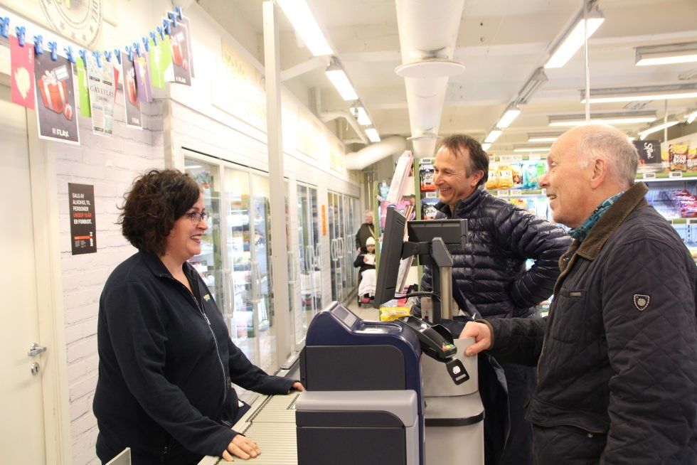 VIKTIG NÆRBUTIKK: Jeanette Kristiansen har allerede merket større pågang på Joker'n etter at 76-bussen begynte å kjøre igjen. Det gleder Pihl og Bonafede. Foto:Bilde 1 av 1