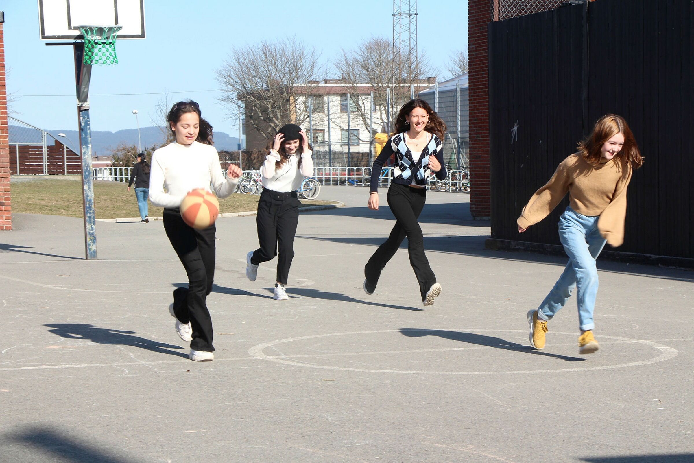 ETTERLENGTET: Erina Rexhepi (f.v), Jehona Zenuni, Emina Basic og Sara Sandven-Volden hygget seg på basketball-banen i en etterlengtet 2 mot 2-kamp. Foto: Sindre Veum ApnesethBilde 1 av 3