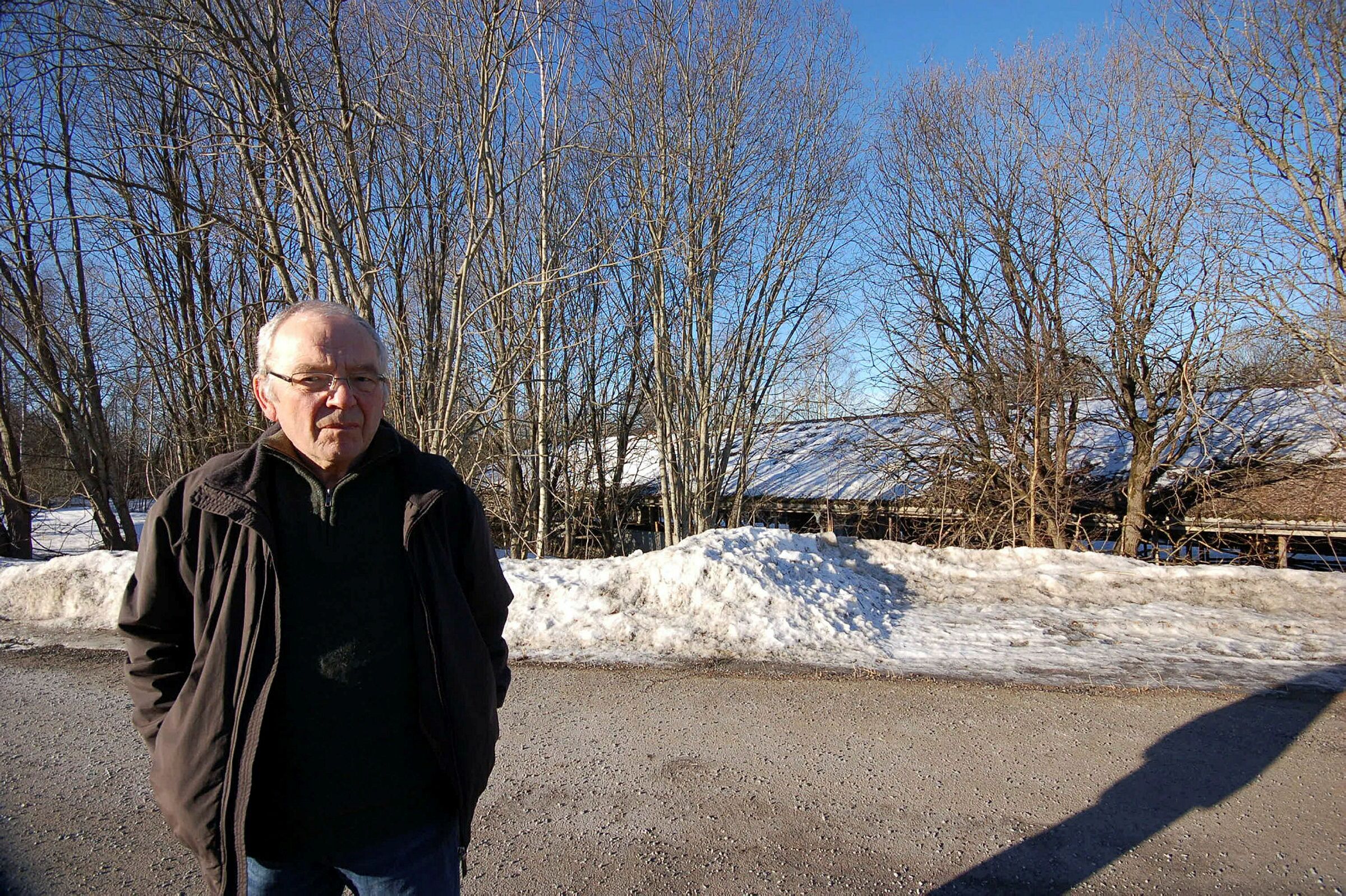 MÅ SANERES: Den lave, grå bygningen som skimtes mellom trærne bak Rolijordet er full av asbestplater og må saneres. Trærne, som utgjør en praktfull, grønn vegg og skjuler bygningen i sommerhalvåret, må også forsvinne. Foto: Rolf KristiansenBilde 1 av 4