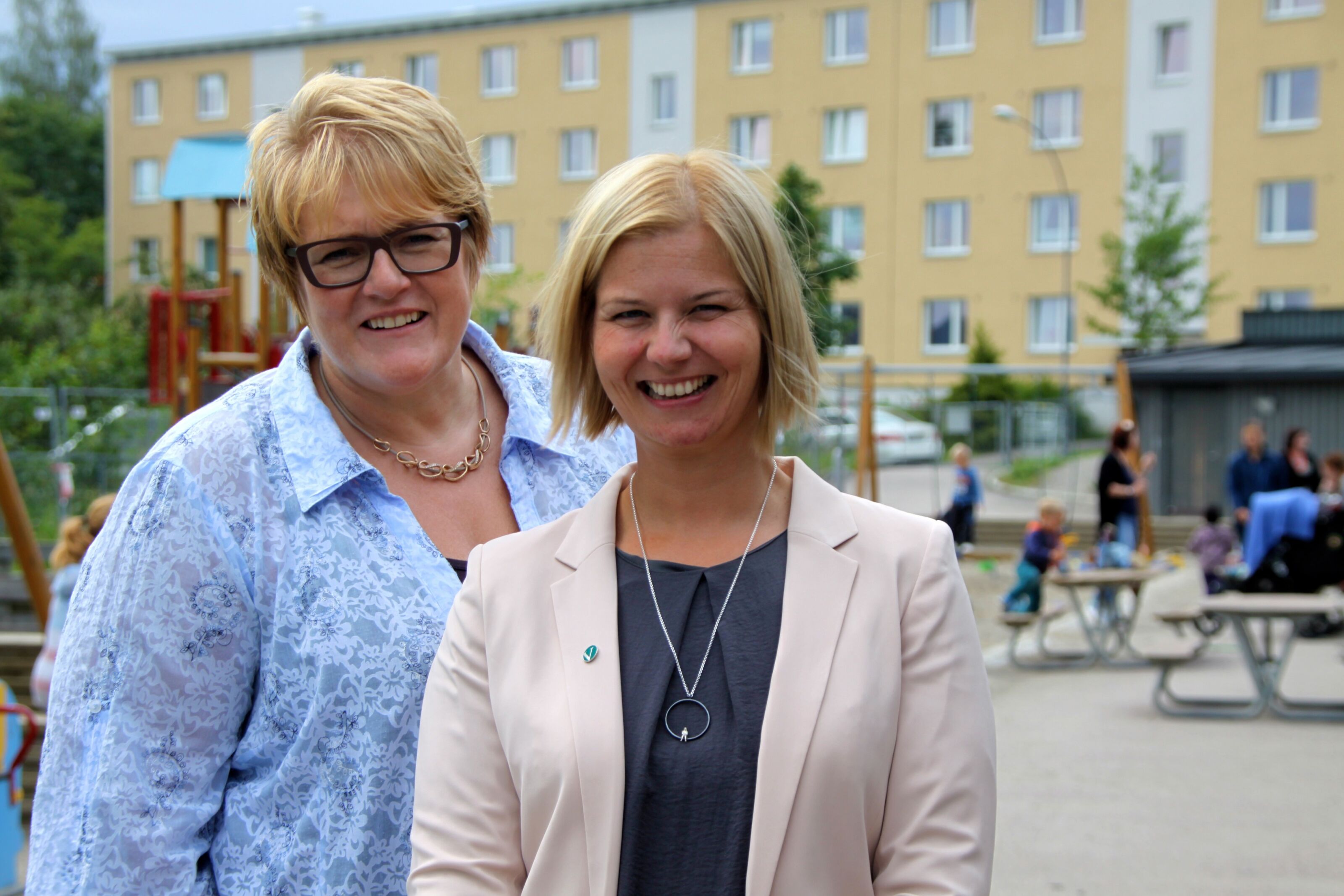 UTVIDER: Venstre har klart å utvide den nasjonale ordningen for gratis halvdagsplass i barnehage til å også gjelde treåringer. Det er gruppeleder Guri Melby (t.h.) i Oslo Venstre strålende fornøyd med. Her sammen med Venstres partileder Trine Skei Grande som har vært i forhandlingene. Foto:Bilde 1 av 2
