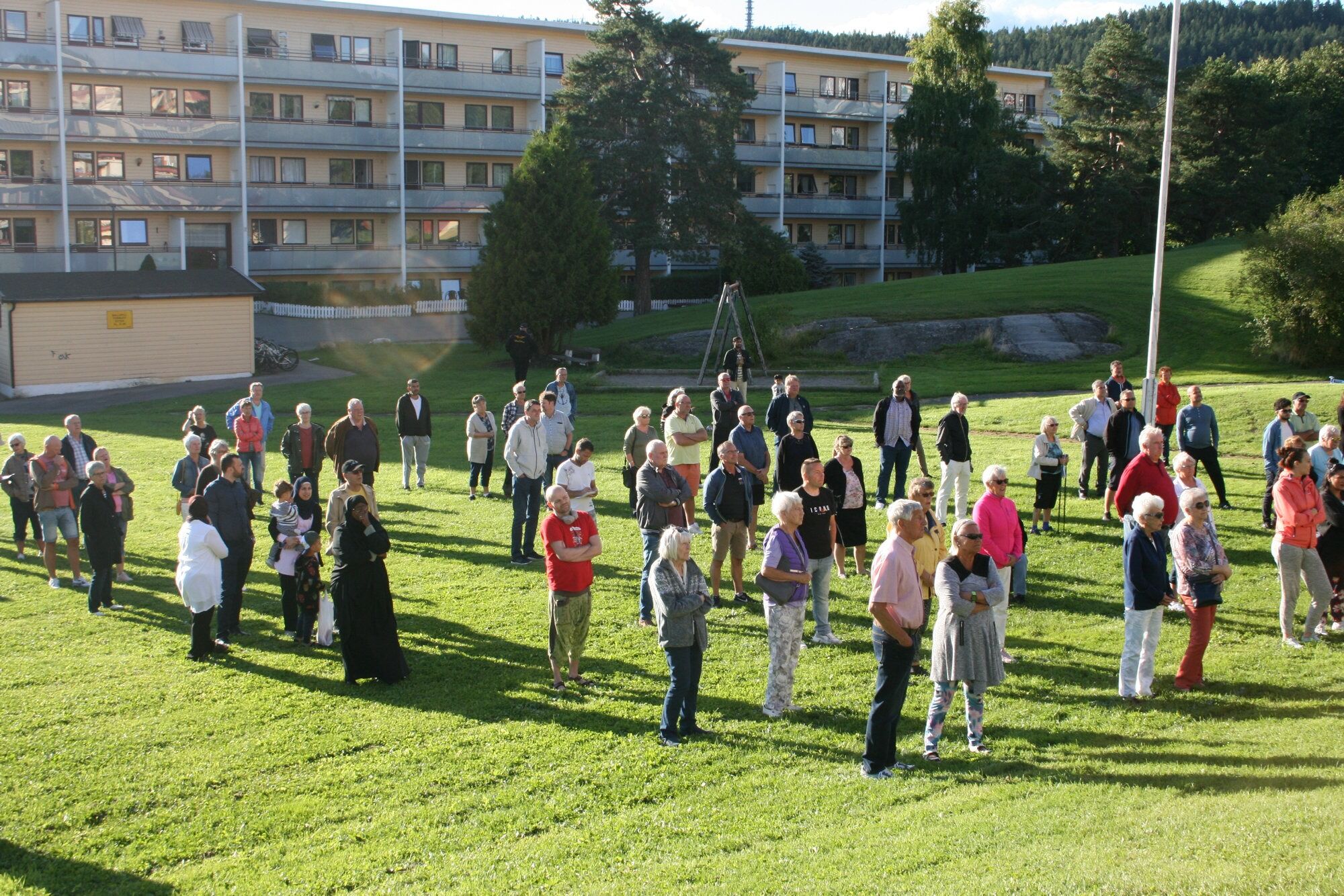 Det er en nokså spontan samling mennesker som samler seg på fellesplenen i Ellen Gleditsch vei 88. Kun dager før kalte diverse vel- og borettslagledere inn til folkemøte for å informere om planene for bygging av barnehage på området.