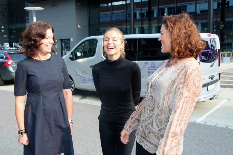 VIL HA TAK I JENTENE: Likestillingsminister Solveig Horne (Frp), rollemodell Nora Holand og NHO-direktør Kristin Skogen Lund frir til jentene med spennende teknologifag. Kun 1 av 5 jenter er ingeniørstudenter. Turnéen «Jenter og teknologi» håper å heve tallet. Foto:Bilde 1 av 1
