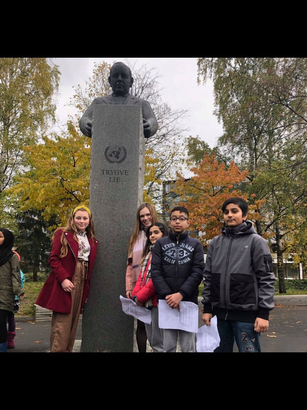 FORMELT: Det ble også kransenedleggelse foran Trygve Lie-statuen. Her med Leah Celine Hasseldahl, Mari Morken, Viana Rahimi, Adil Raja og Hashir Raja. Foto:Bilde 1 av 4