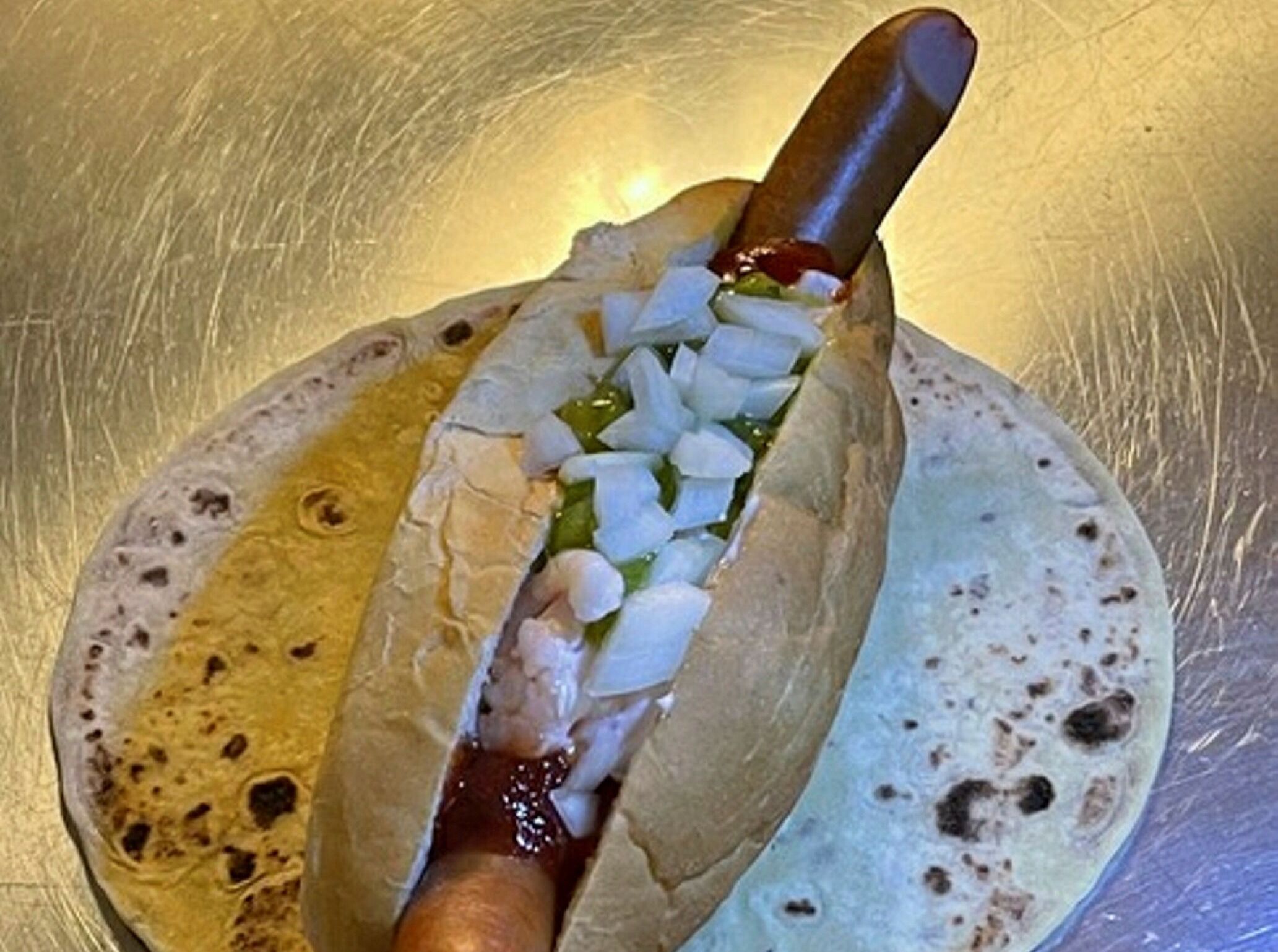 Rekonstruert bilde av en Spesial; pølse i brød med ketsjup, sennep, rå løk, rekesalat og relish. Lompa skal på toppen, for å hindre at hele greia eksploderer. Foto:Bilde 1 av 1