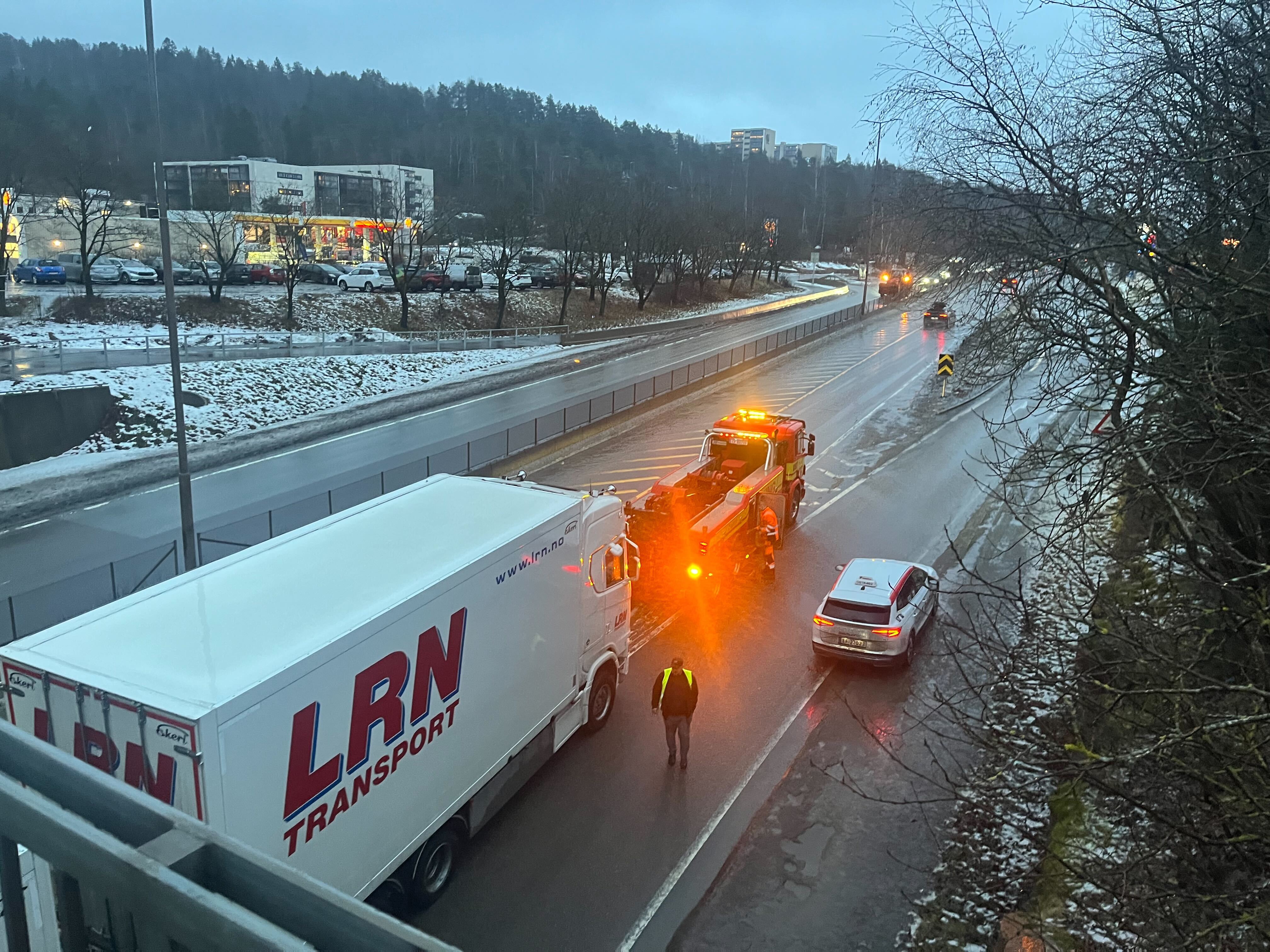 Et vogntog har fått trøbbel på Trondheimsveien ved avkjøringen til Grorud. Bilberger er på stedet, men vogntoget står delvis i veien for avkjørsel. Bilister som skal opp til Grorud må kjøre delvis ut av veibanen for å komme forbi.