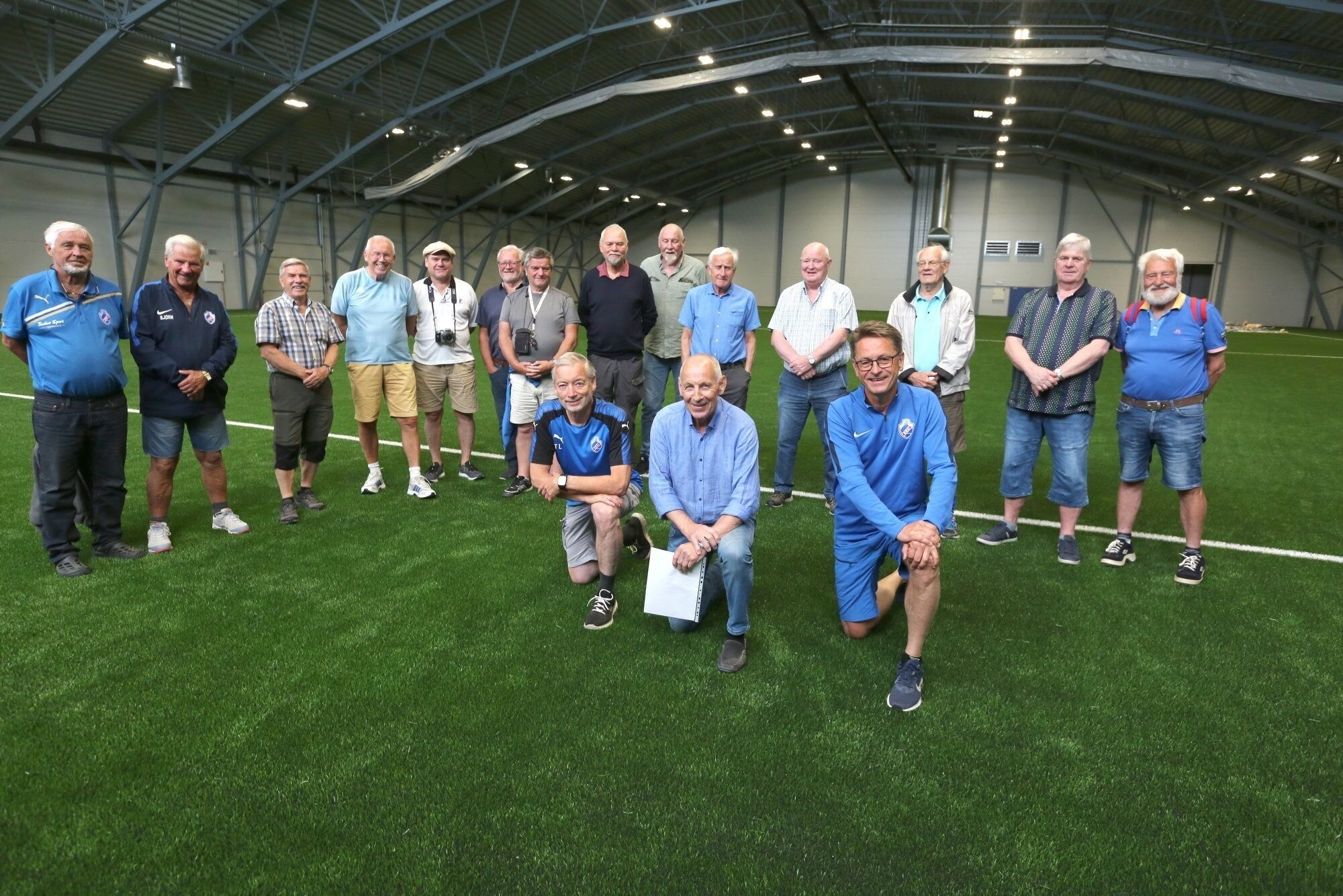 SKIKKELIG VETERANGODKJENNELSE: Leder for Grei-hallens byggekomité, Bjørn Haug, her flankert av Tom Løw (t.v.) som allerede i 2012 kom med ideen om å bygge innendørs fotballhall, og styreleder i SF Grei, Asgeir Moripen, satte pris på at de ærede herrer i Oldermannslauget tok turen til den nye hallen for å ta den i beskuelse og få en orientering om hvordan den har kommet på plass i løpet av et knapt års tid. Foto:Bilde 1 av 2