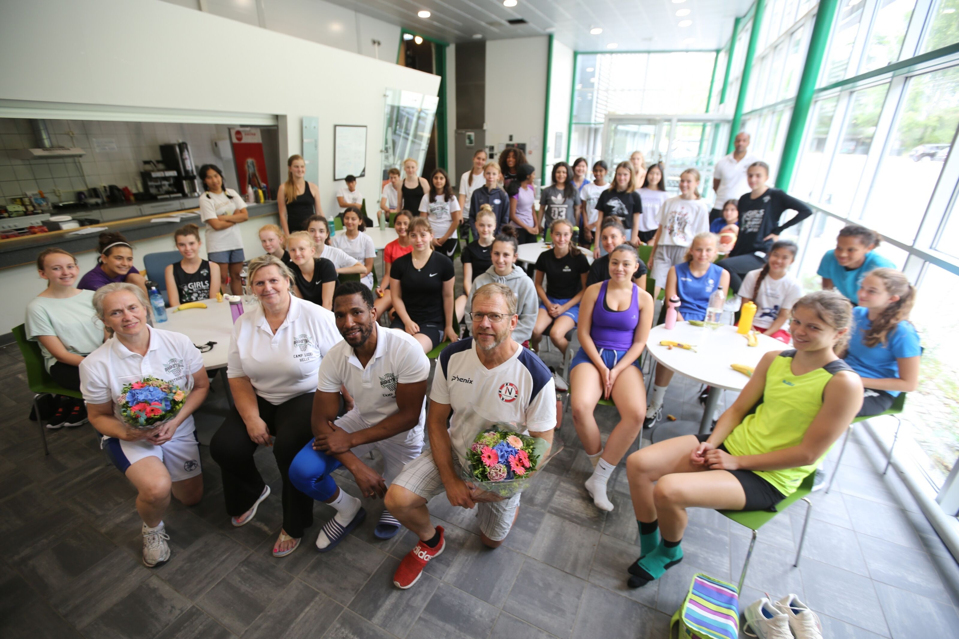 STOR BASKETKUNNSKAP: Det var mange med basketerfaring utenom det vanlige som var engasjert da den første rene jentebasketcampen noensinne ble avviklet. På kne i front foran 13-17-års ågruppa ser vi den mestvinnende NM-vinneren gjennom tidene, Lisbeth Jansen (Høybråten Basketballklubb), leder i Ammerud Basket, Helle Cecilie Stokke, Ammerud BLNOs egen Orji Okoroafor og tidligere landslagsspiller/trener Ståle Frey. Foto:Bilde 1 av 4