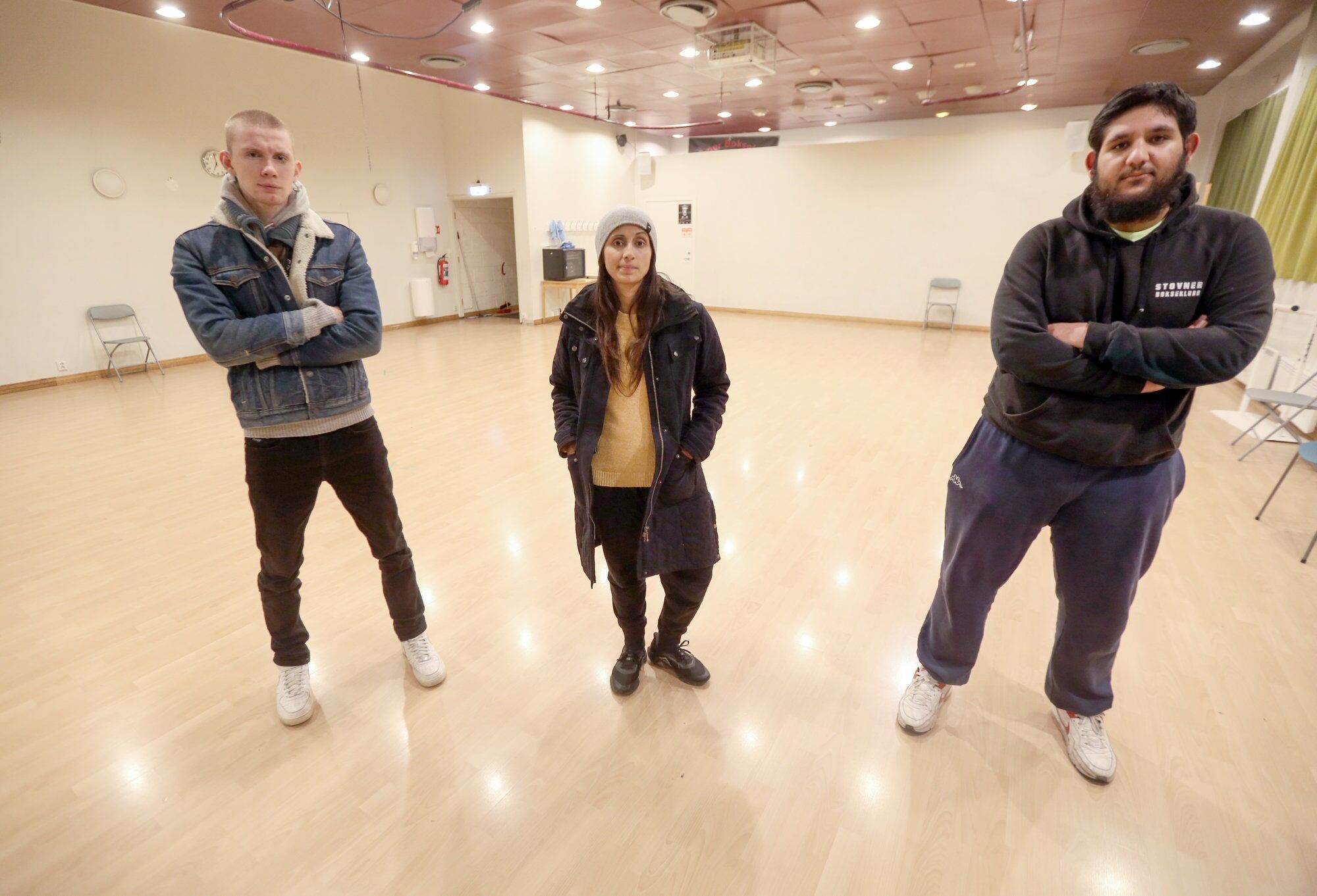 TOMME LOKALER: Tidligere trente Stovner Bokseklubb i dette lokalet i Verdenshuset på Haugenstua. Det er allerede for lite for klubbens virksomhet. Men nå har de ikke en gang tilgang dit grunnet korona og at det meste er stengt grunnet brannsikkerheten. Men problemet er at ingen har klart å skaffe dem nye lokaler de kan fortsette virksomheten i. Juniortrener og utøver Magnus Nygård (f.v.), jentetrener og barnevernspedagog Hina Zaida, og utøver Farqaleet Iqbal i Stovner Bokseklubb fortviler. Foto:Bilde 1 av 4