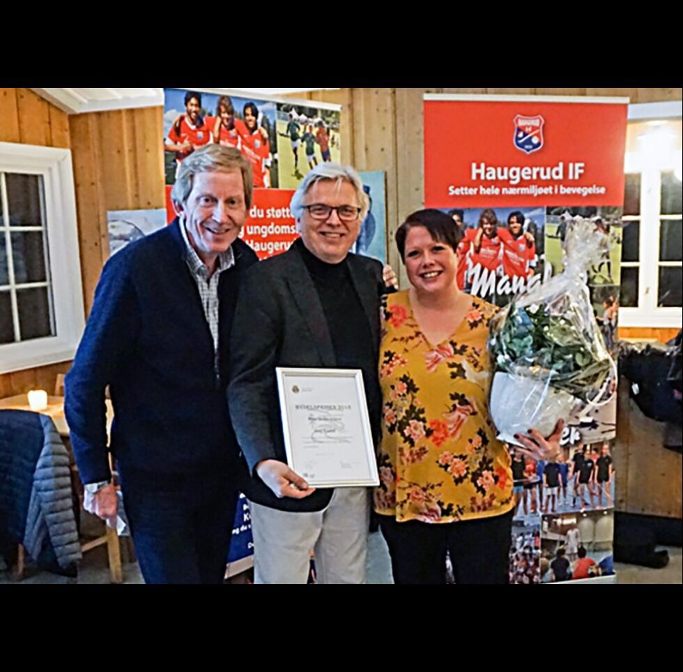 KOM MED PRISEN: Leder og nestleder i Alna bydelsutvalg, Knut Røli og Monique Nyberget Hiller, overrasket leder i Haugerud IF, Dag Endal, med Bydelsprisen. Foto:Bilde 1 av 1