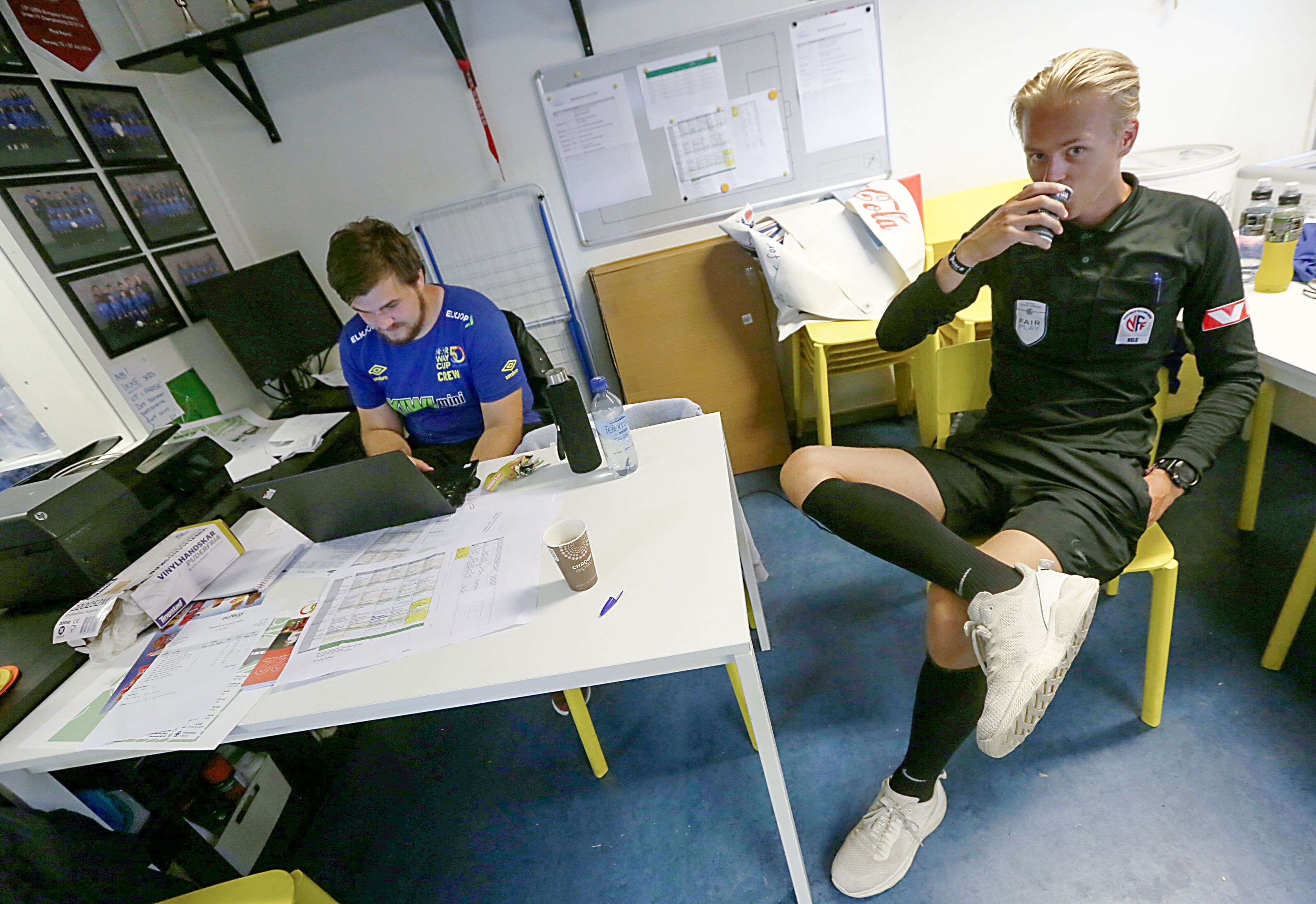 FORTJENT KAFFE: Med så mange kamper å dømme er det deilig med en pust i bakken og en kopp kaffe. Dommer Adrian Nergård slapper av i kiosken/varelageret til Furuset hvor sekretariatsleder Tobias Linneberg også utfører sine daglige gjøremål under Norway Cup. Foto: Rolf E. WulffBilde 1 av 1