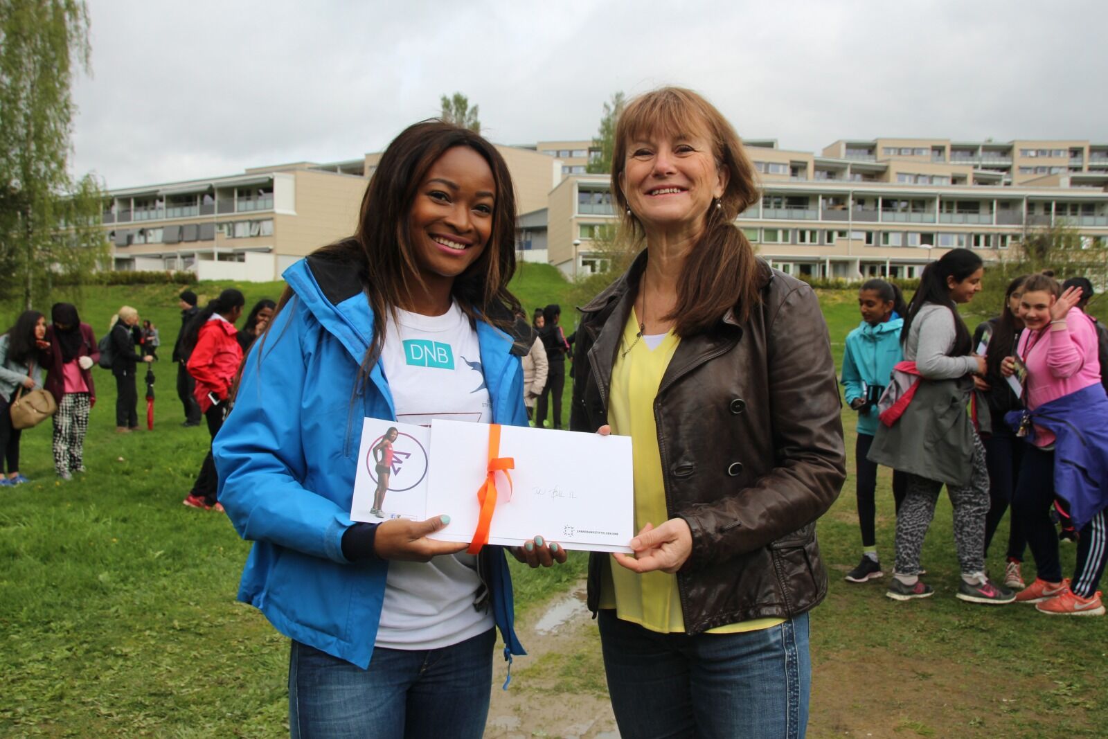 MIDLER: Birthe Selvaag overrakte sjekken til Ezinne Okparaebo som skal støtte hennes og BUL ILs planer om et friidrettsanlegg i Groruddalen. Foto:Bilde 1 av 1 Ezinnes nye lekegrind Sindre Veum Apneseth Publisert 28. mai 15 kl. 12:31 Del på sosiale medier Del Facebook Twitter E-post Abonnement