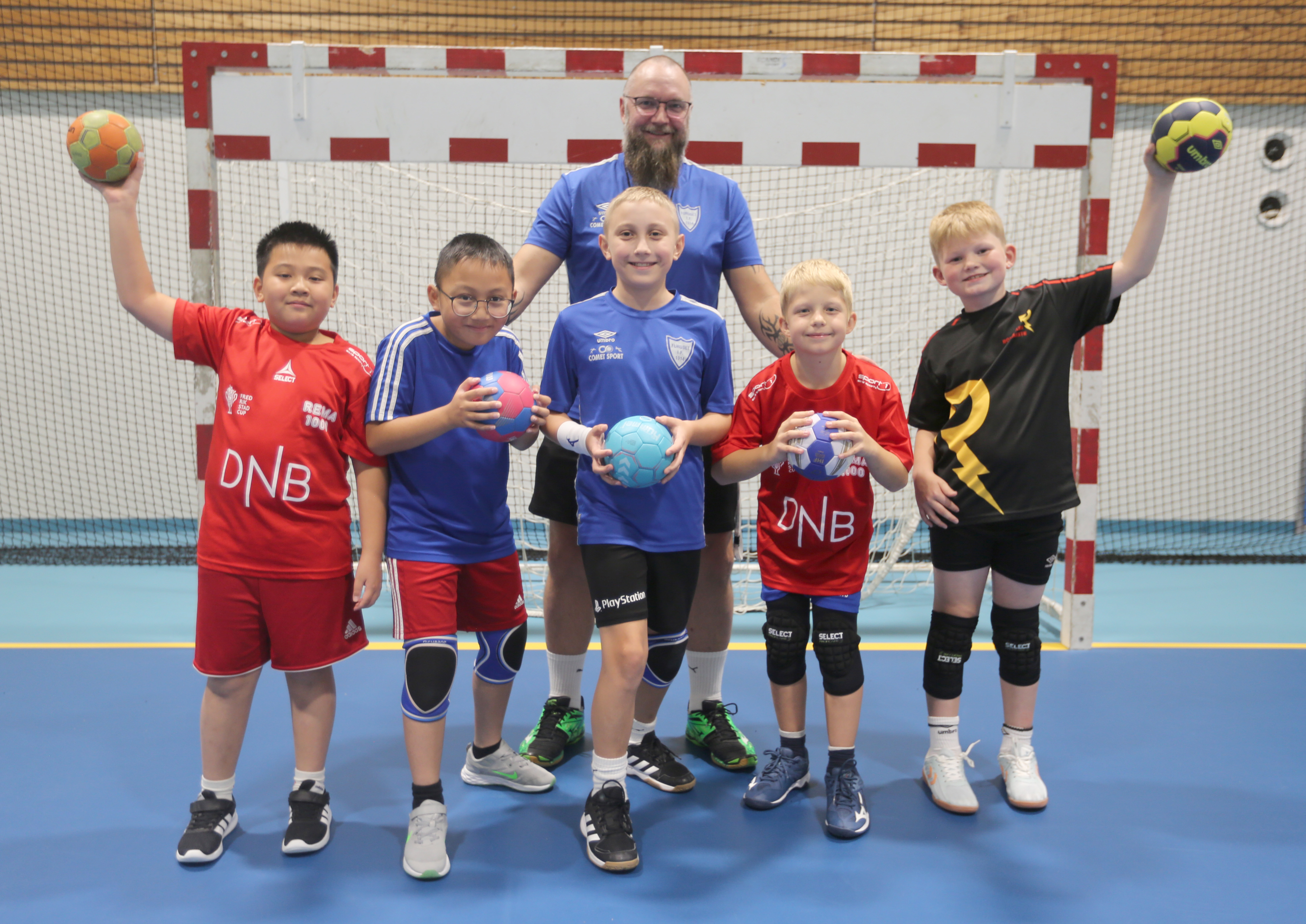 TØFFE HÅNDBALLGUTTER: Trener Jan Roger Halvorsen i Furuset Håndball har få men talentfulle håndballspillere for øyeblikket. Nå håper han at flere gutter på Furuset og i nærliggende områder vil prøve seg på den fartsfylte og tøffe sporten. Da vil de bli tatt godt i mot av Henrik (9) (f. v.), Nicholas (10), Marius (10), Kasper (9) og Birk (8). FOTO: Rolf E. WulffBilde 1 av 2