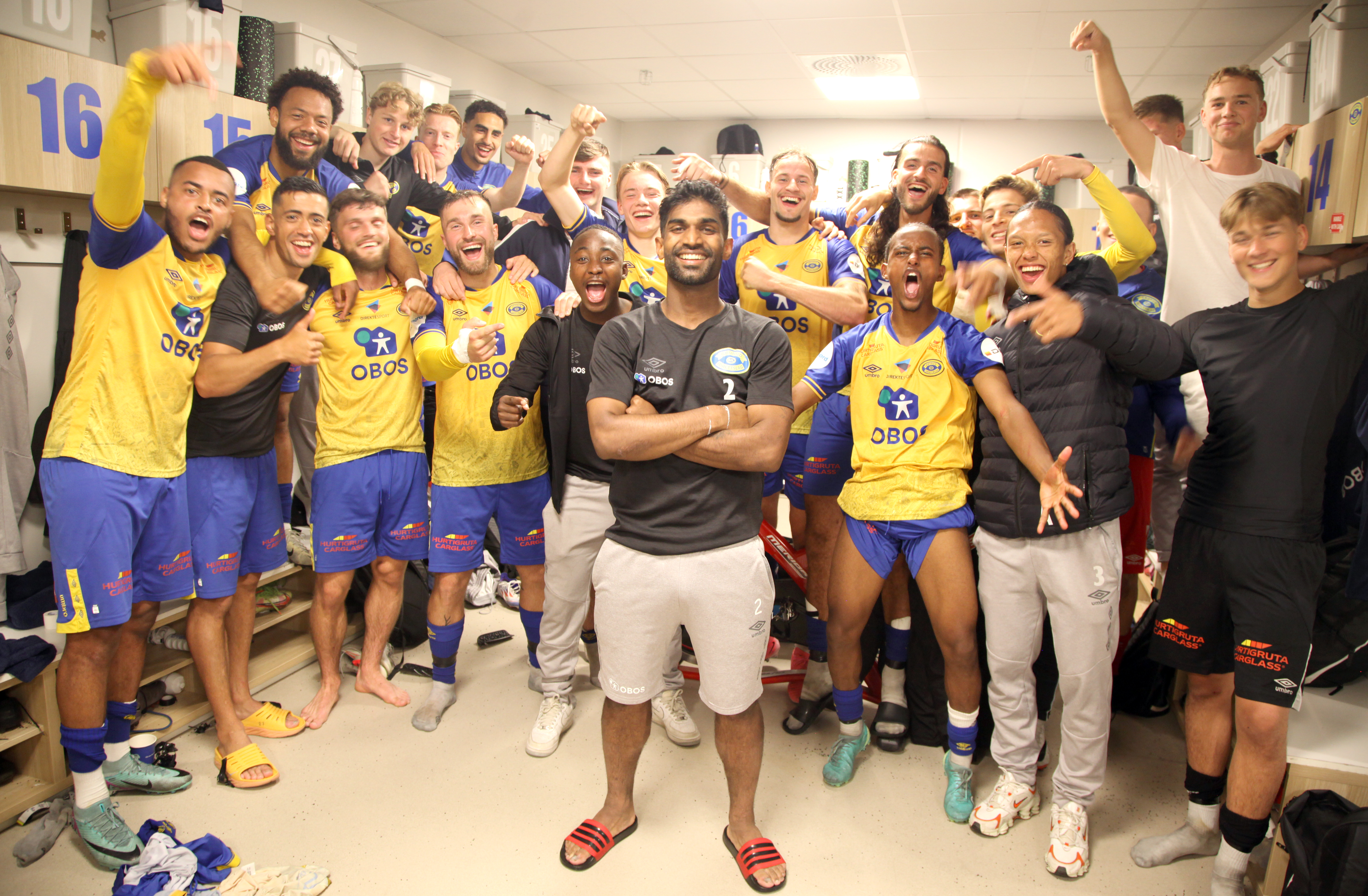 NYGIFT LAGKAMERAT: Mathusan Sandrakumar i front av jublende lagkamerater. Mer jubel ble det etter kampen da hele gjengen dro rett til lagkameratens bryllupsfest. FOTO: Rolf E. WulffBilde 1 av 15
