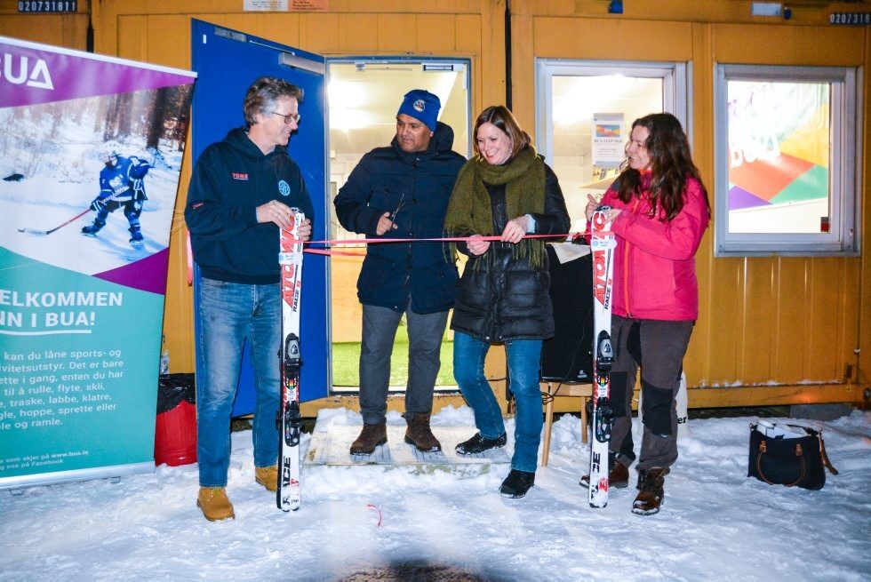 HØYTIDELIG: Ole Edvard Stovner Weisæth (f.v), Rashid Nawaz, Hanna E. Marcusen og Monica Vogt klipper båndet og markerer at BUA er åpen. Foto:Bilde 1 av 3