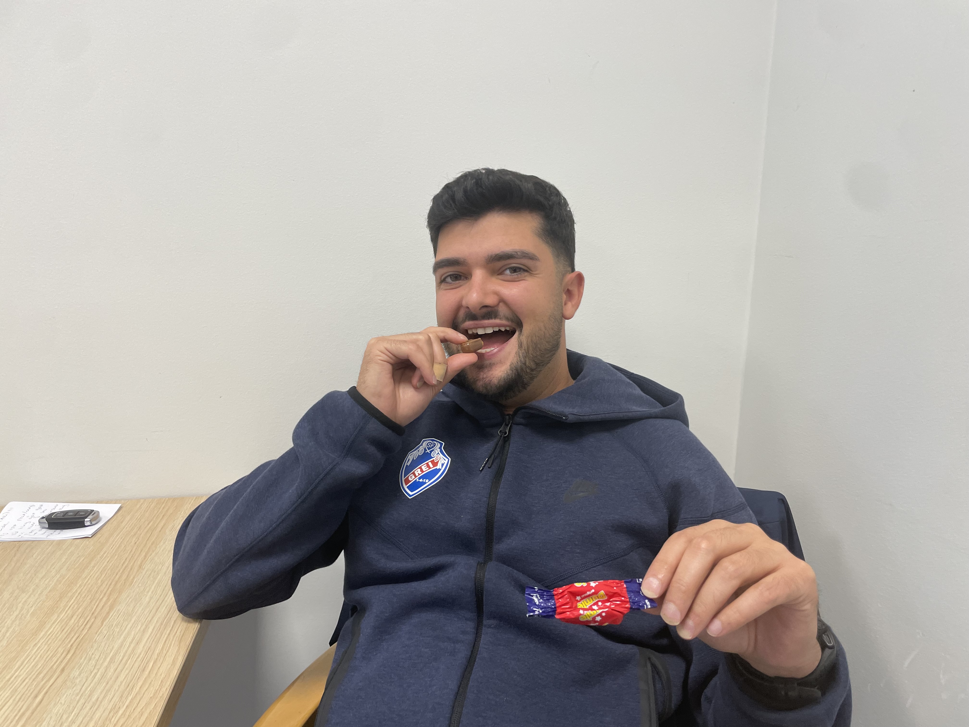 SUTTE PÅ KARAMELLEN: Grei-trener Koorush Ansari nøt trepoengeren – og foretrekker karamellen sin dyppet i sjokolade, helst i form av en Dumle.Bilde 1 av 7