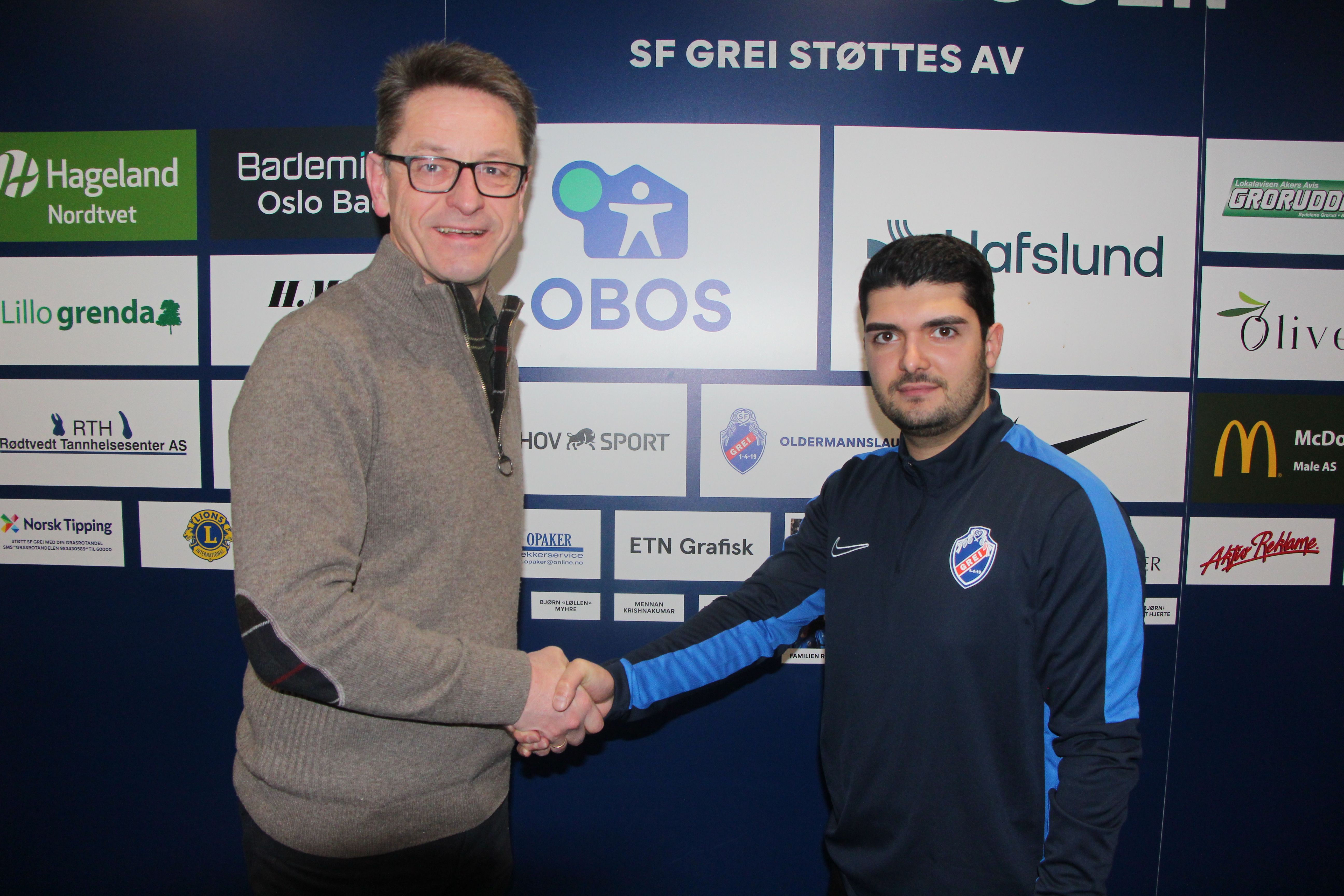 NY HOVEDTRENER: Styreleder Asgeir Moripen (t.v.) tar den nye hovedtreneren for Grei-kvinnene, Koorush Ansari, i hånda. Nå er de klare for sesongen. FOTO: Sindre Veum Apneseth