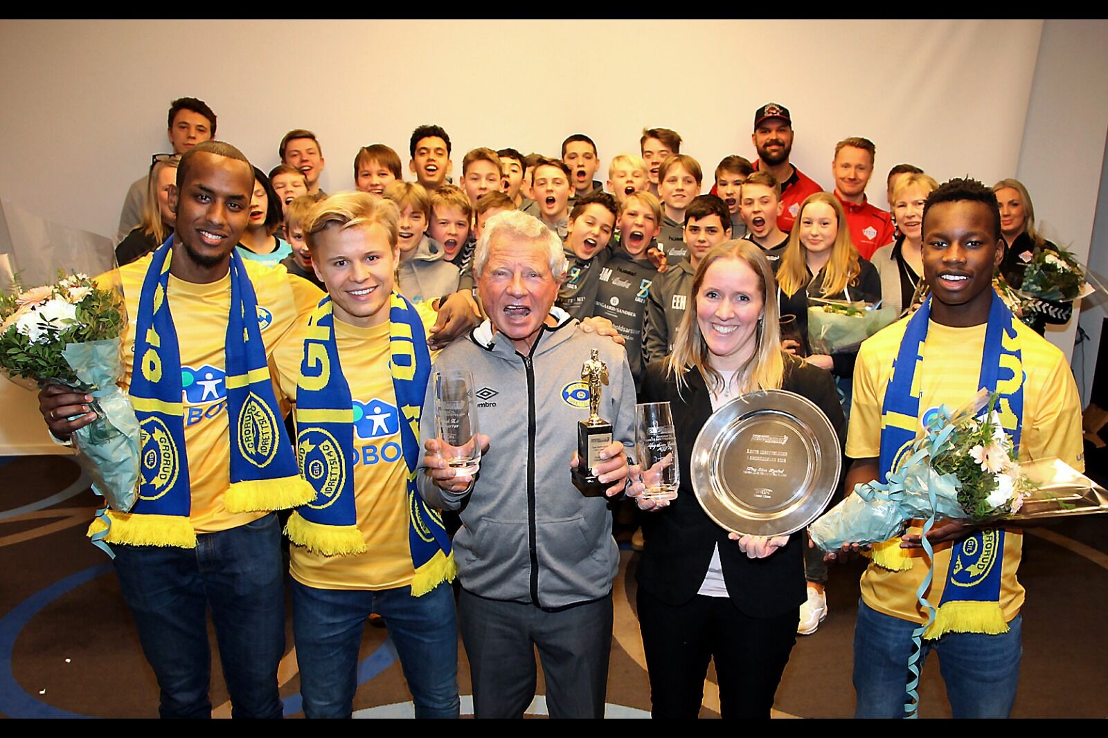 IDRETTENS VINNERE: Grorud ILs fotballherrer, her representert ved Faysal Ahmed, Petter Mathias Olsen, Richard Pedersen og Omar Drammeh, ble kåret til årets idrettsutøver i Groruddalen for sportsåret 2019, mens May Linn Hystad fra NJJK gikk til topps på ledersiden. Bak står de øvrige kandidatene Nikola Milatovic, Linje 5s håndballgutter, Sveivas innebandyherrer, Hege Almerud, Eva Isabel Erbe og Hanne Gulbranzen. Foto: Tom EvensenBilde 1 av 4