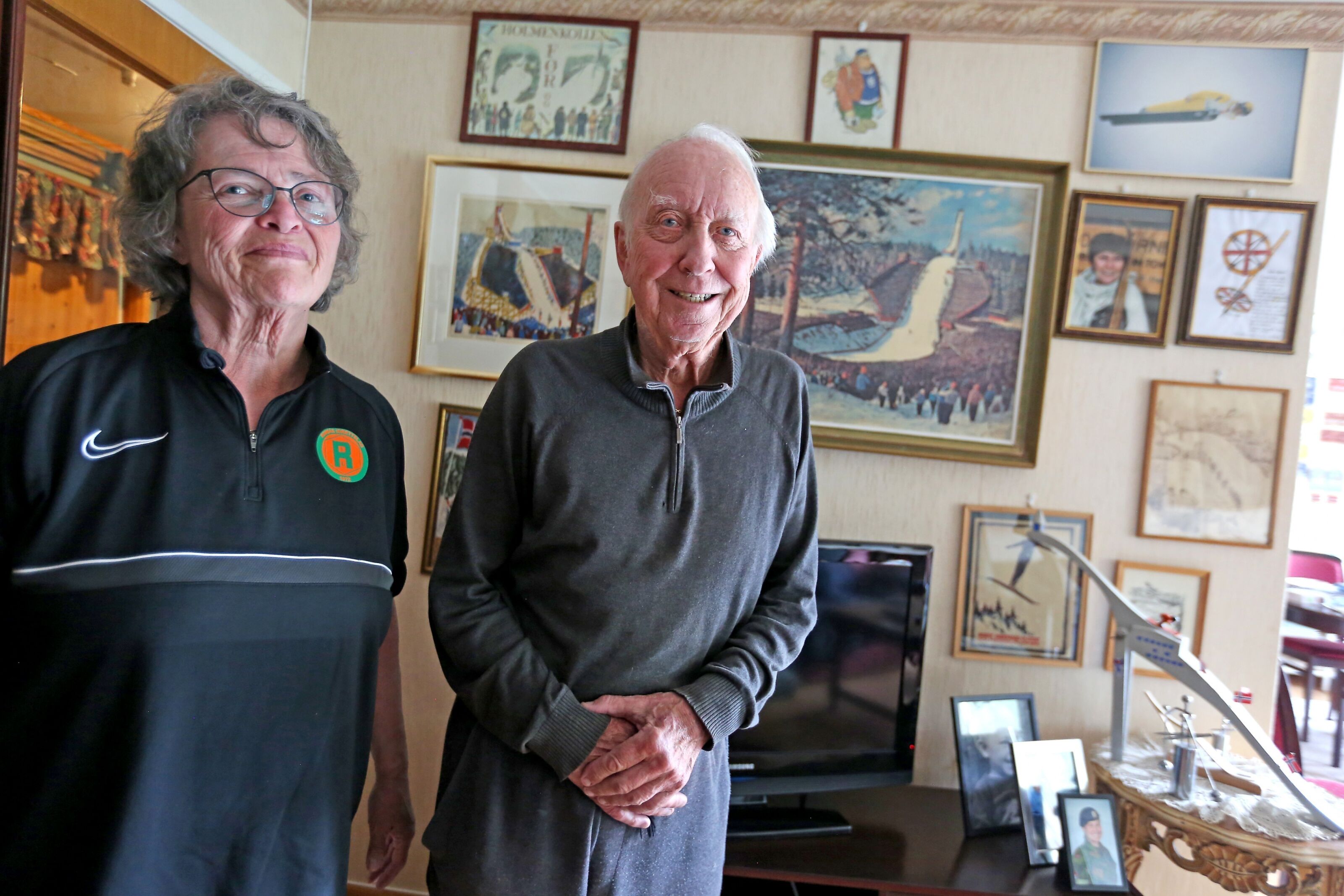 KOSELIG MIMRESTUND: Vi tok turen til Bjørn Erik Johnsen som var blant dem som fikk i gang Romsås IL for 50 år siden sammen med dagens leder Sissel Smeby. Det ble mimring om fortid og noen høydepunkter gjennom årene, samt klubbens viktige funksjon for både idrett og samholdet i lokalmiljøet den dag i dag. På veggen bak øverst til høyre er det bilde av sønnen Erik Johnsen svevende gjennom luften. Gutten som seks år gammel satte utfor ganske krevende store Ravnkollbakken og siden tok OL-sølv i Calgary i 1988. Foto: Rolf E. WulffBilde 1 av 3