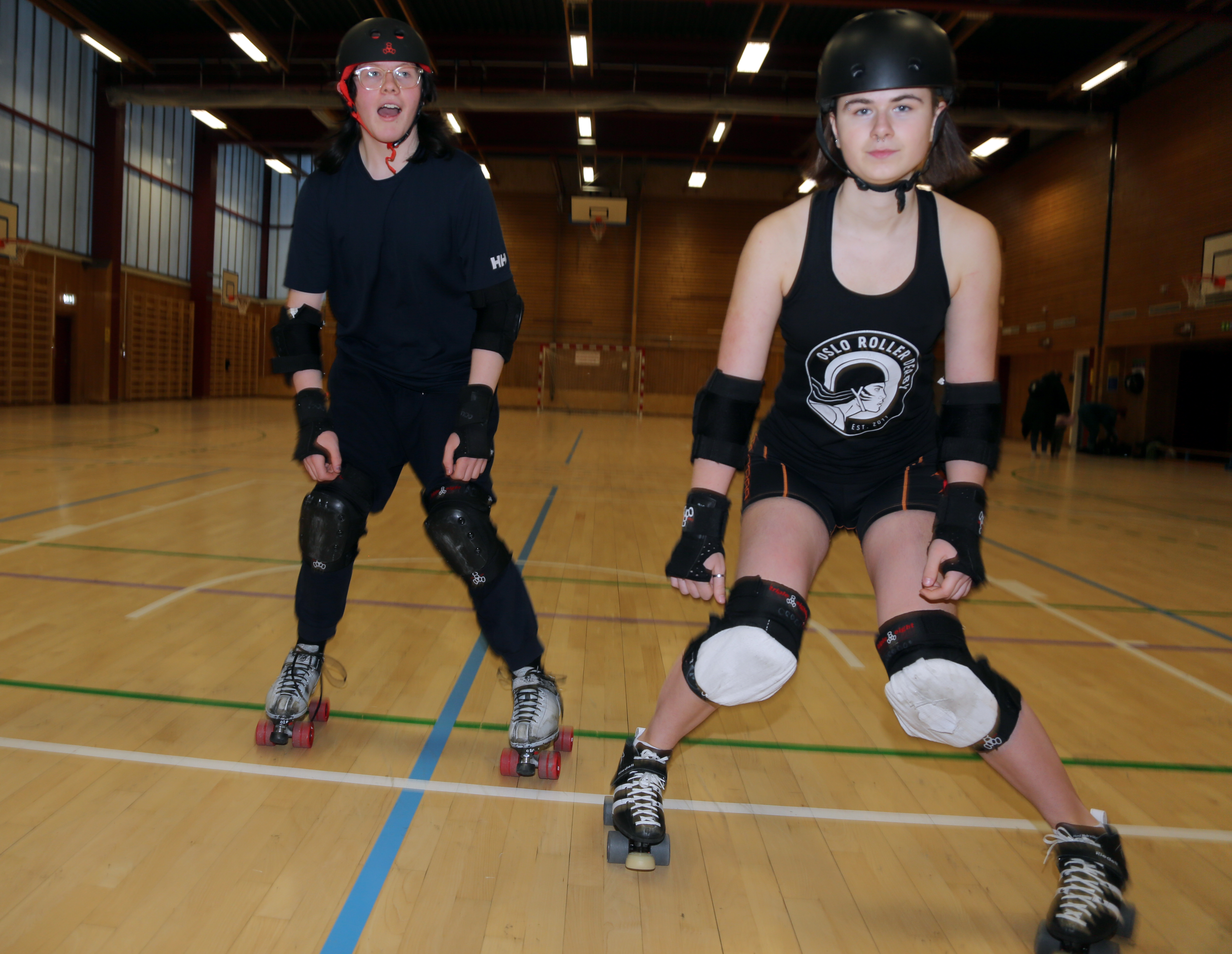 FØRSTE GANG: Helle Stub-Madsen (16) er aktiv utøver i Oslo Roller Derby Klubb. Nå har hun fått med seg klassekameraten Jens Svalsrød (16) med i sporten etter at han prøvde seg på rulleskøyter i Haugenstua Idrettshall. FOTO: Rolf E. WulffBilde 1 av 2