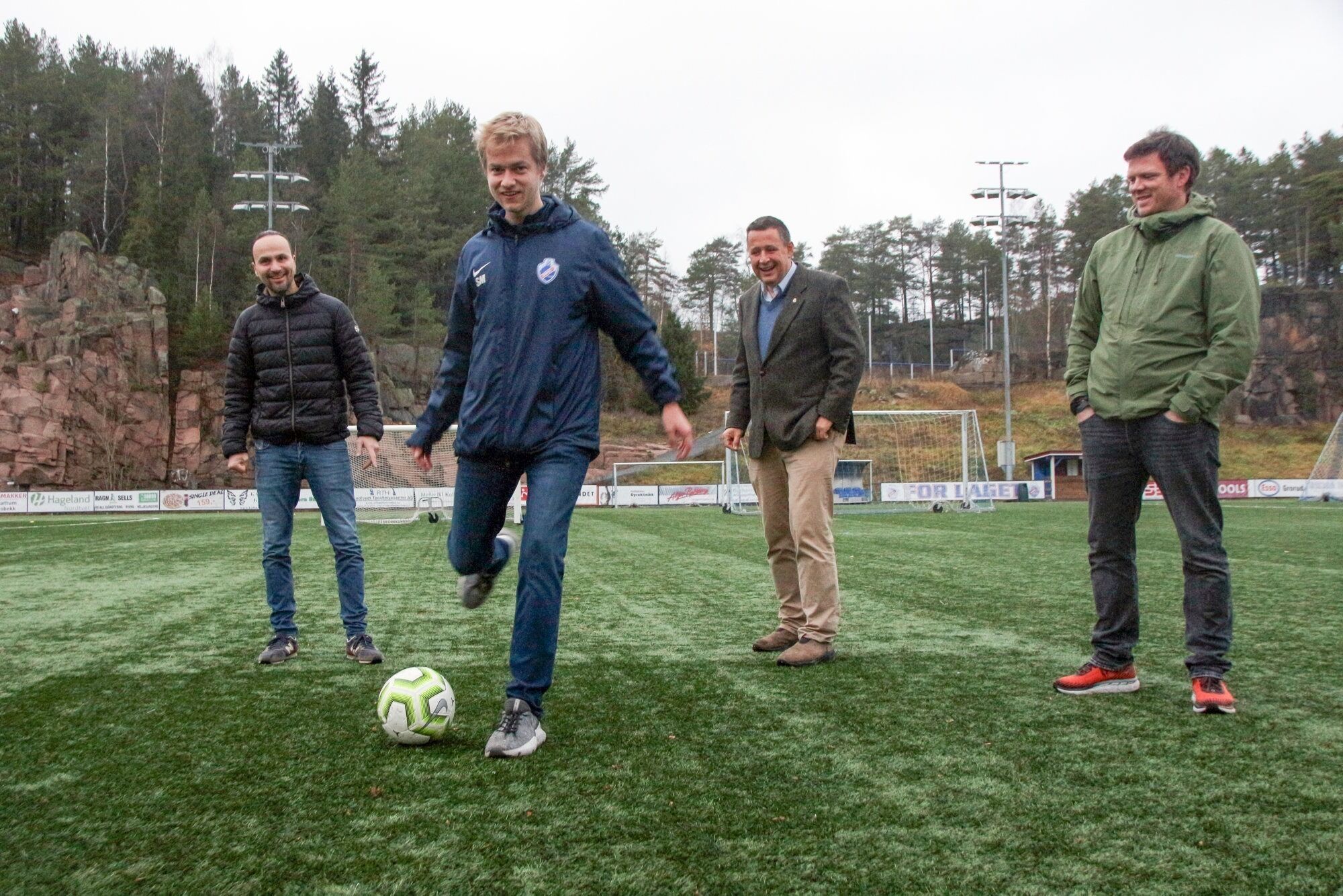 BLI MED!: Mikael Oguz, Sondre Moripen, Espen Andreas Hasle og Anders Langfeldt-Rugelbak er i toppform på Grei-banen, for nå rulles fritidskortet ut til samtlige barn og unge i bydelen. Foto:Bilde 1 av 3
