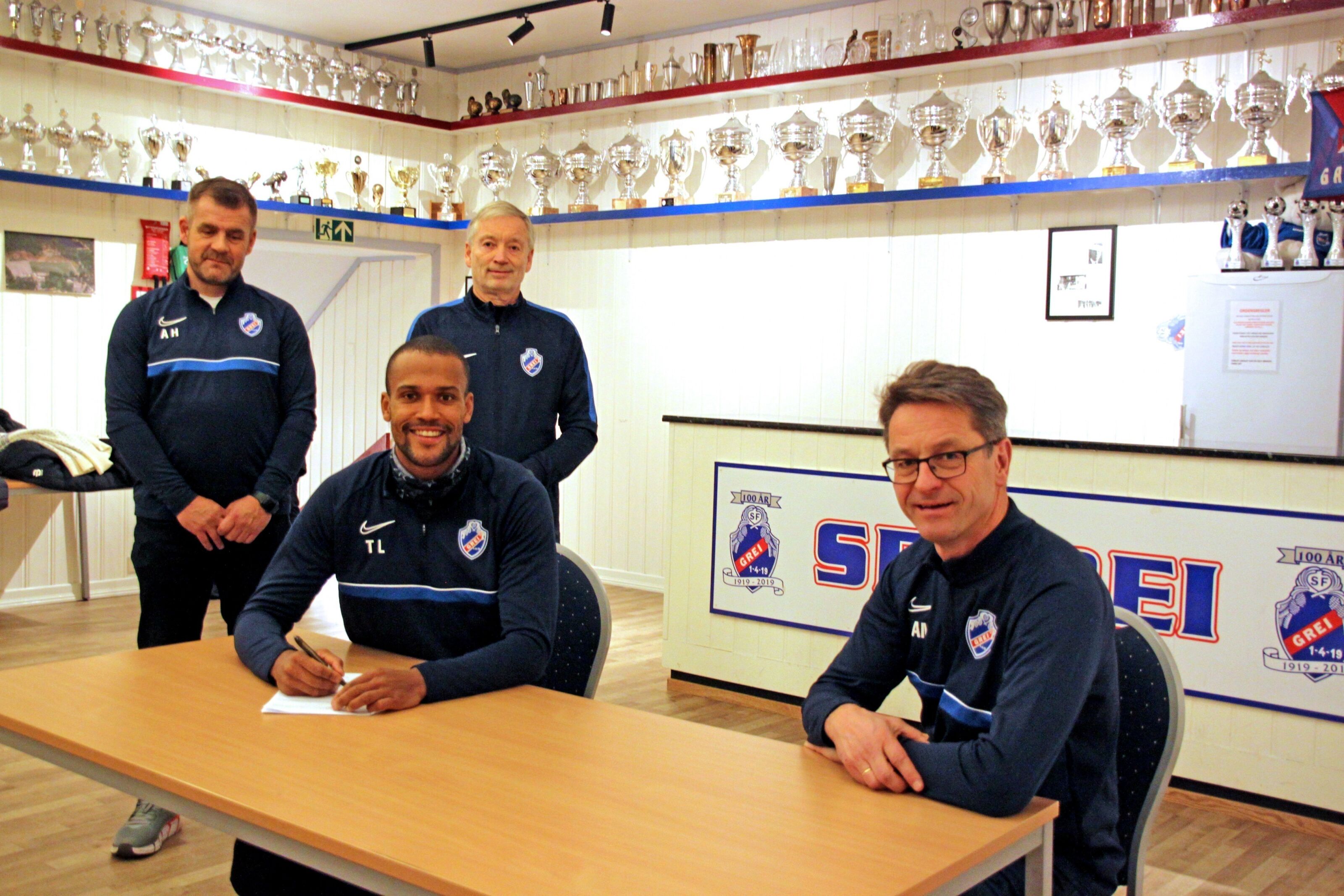 SKREV UNDER KONTRAKTEN: Mandag signerte Markus Norheim Cham under en kontrakt som gjør ham til SF Greis nye A-lagstrener. Med seg i støtteapparatet får han Jon Halvor Storstrøm (bak til venstre). Leder for SF Grei, Asgeir Moripen, og medlem av fotballstyret, Tom Løw (bak til høyre) er godt fornøyd med signeringene og gleder seg nå til en ny fotballsesong – denne gangen i 3. divisjon. Foto:Bilde 1 av 2
