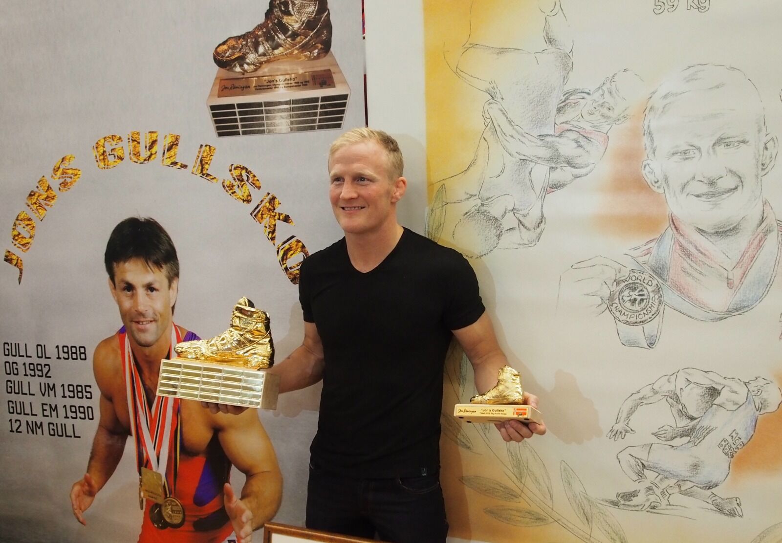BLE HEDRET: Stig Andre Berge fra OBK med gullskoen. Bak Stig-André ser vi et banner av Jon Rønningen med alle sine medaljer og et kollasj av Stig-André malt av Åge Merli (bronsevinner av NM for gutter i 1963). (Foto: Per-Kristian Støvring.) Foto:Bilde 1 av 1